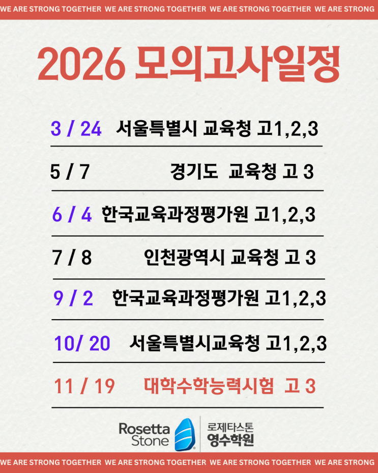 2026학년도 고등 모의고사 일정 총정리! 신창동 로제타스톤이 제안하는 필승 전략 신창동 영수학원의 자부심, 로제타스톤 영수학원입니다! 어느덧 2026학년도를 대비해야 하는 시기가 다가왔습니다. 해마다 이맘때면 고등학교 입학을 앞둔 예비 고1 친구들과 학부모님들의 문의가 부쩍 늘어나는데요. 특히 중학교와는 차원이 다른 '모의고사'라는 벽을 어떻게 넘어야 할지 고민이 많으실 겁니다. 오늘은 발표된 2026학년도 모의고사 일정과 함께, 우리 아이들이 흔들리지 않고 성적을 쌓아올릴 수 있는 실전 팁을 아낌없이 공유해 드릴게요! 특히 '예비 고1', 왜 3월 모의고사가 공포의 시작일까요? 중학교 때까지 '영....... <img src="https://blogthumb.pstatic.net/MjAyNjAyMjVfMjk0/MDAxNzcyMDIxMDE1NTg2.kIqIj36-7sXHoHyGRWU47uoIOI_mUlso3lZ0ZZK4cLAg.VMtmdJstj4eh2SoyJu0uKYFN492ovjlolVzDFFbpqD8g.PNG/2026_모의고사_일정.png?type=s3" />