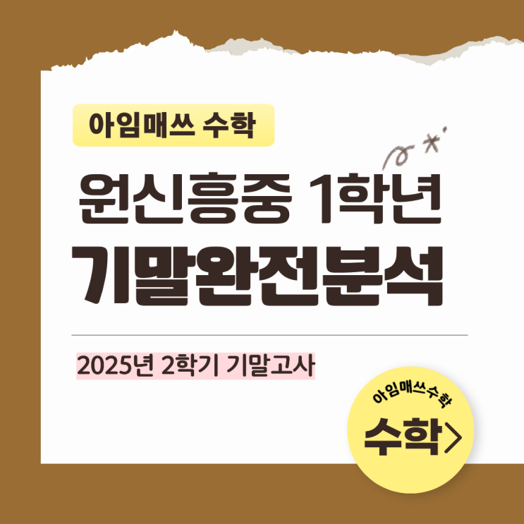 안녕하세요. 아임매쓰수학입니다. 원신흥중학교 1학년 2학기 기말고사에 대해서 분석해보도록 하겠습니다. 이번 기말고사 수학시험은 교과서 기본 개몀을 중심으로 하되, 개념의 정확한 이해와 적용력을 동시에 요구하는 시험으로 출제되었습니다. 전반적으로 중간 난이도에 해당하지만, 문항 구성상 학생들 간 점수 편차가 발생하기 쉬운 시험이었습니다. 1. 전체 난이도 분석 ● 전반 난이도: 중상 ▶ 상위권 변별력은 충분합니다. ▶ 기본 개념이 불안한 학새에게는 난이도가 높았던 시험입니다. 특히 단순 계산 위주의 시험이 아니라, ☞ "왜 그렇게 되는가"를 이해하지 못하면 풀기 어려운 문제가 다수 포함되어 있습니다. 2. 단....... <img src="https://blogthumb.pstatic.net/MjAyNTEyMTZfMjAy/MDAxNzY1ODk1MjM0NTc4.NBJMxVuB7KsWdYj2ITsVcIQK1X9P1ucPuwyMfpAGFdIg.K6LfzJFlrnvX6koH4TLYWbmvv5EEJBlWTo_ITEyl430g.PNG/4.png?type=s3" />