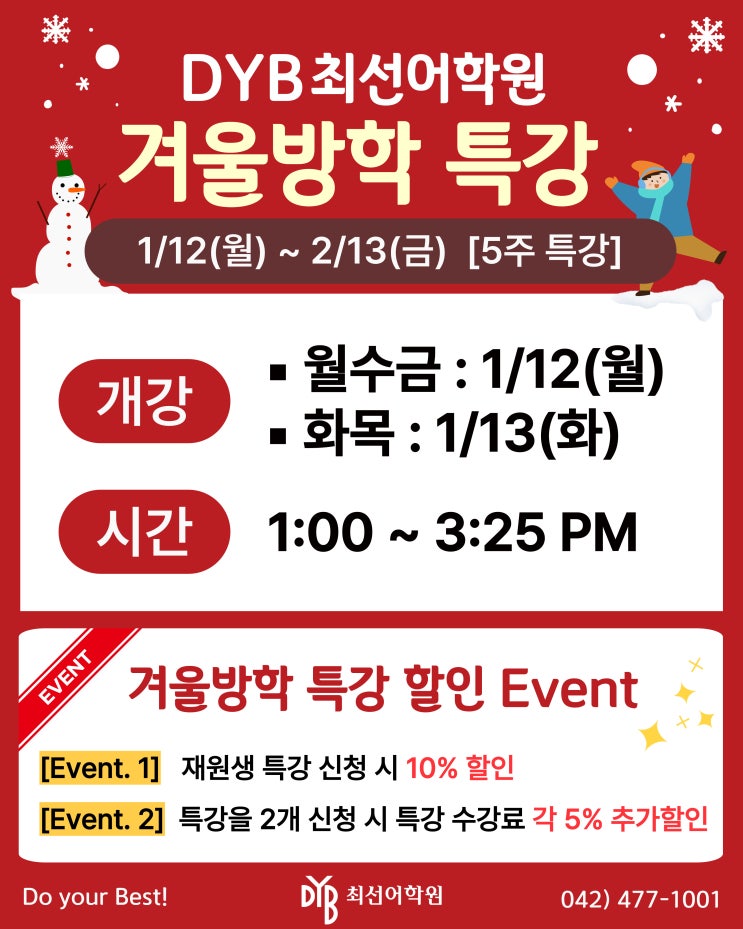 [공지] DYB 최선어학원 둔산캠퍼스 26년 겨울방학 특강 개강!!