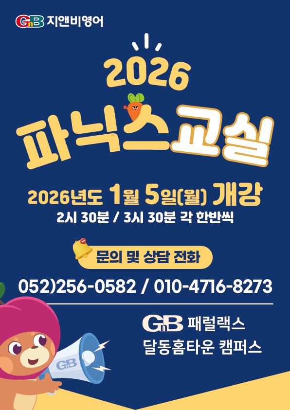 2026학년도 신규 파닉스 교실이 2026년도 1월5일(월)에 새롭게 OPEN합니다. <GnB 파닉스 교실>은 알파벳과 파닉스를 기초로 다양한 방법으로 영어를 흥미롭게 경험하는 수업입니다!! 예비 초 ~ 초등 저학년 아동들을 대상으로 알파벳 문자의 인지와 각 철자에 해당하는 소리를 배우는 과정을 거쳐 Storybook Reading과 기초영어회화 표현을 배우고 Immersion (영어몰입교육)수업을 경험하는 과정입니다. 학습 특징 즐겁고 신나는 GnB 영어 파닉스 교실 우리 아이의 첫 영어 교실이 되어 드리겠습니다!! 문의 및 상담 : 052-256-0582 #파닉스#초등영어#지앤비#지앤비영어 #야음동영어학원 #야음동초등영어#대현초영어#동백초영어#청솔초영어....... <img src="https://blogthumb.pstatic.net/MjAyNTEyMTRfMTcw/MDAxNzY1NjgxNjI1NzUw.EJxhKbWl9oJN6aznKtvUw0qwaum3NnWo6rKgbETFGTsg.cNw_FmUOuQBrOzBFIOTGKkuFRRmgUIpFE3XIpyqjjGMg.PNG/2026%C7%D0%B3%E2_%C6%C4%B4%D0%BD%BA%B1%B3%BD%C7-a4%BF%EB.png?type=s3" />