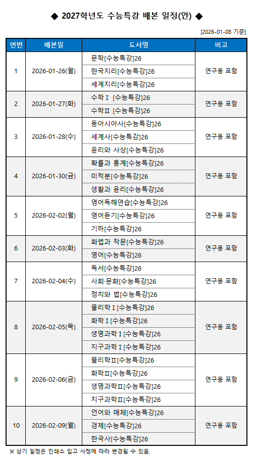 ✅. 전체 개요 • 기간: 2026.01.26(월) ~ 2026.02.09(월) • 대부분 ‘연구용 포함’ • 국·영·수 + 사회·과학 전 영역 ① 독해 중심 파트 (핵심) ✅ 영어독해연습 ✅ 영어 수업 포인트 ✔ 문장 해석 ❌ → 문단 관계 파악 ✔ 빈칸·순서·요지 → 근거 찾기 훈련 ✔ “왜 이 선지가 답인지 말하게 하기” 많이 푸는 것보다 ‘어떻게 푸느냐’가 훨씬 중요합니다. ① 고3 영어 관리의 1순위: 점수 흔들림 방지 고3들이 제일 많이 무너지는 이유: ✅ 시험마다 점수가 출렁여서 ⭕️ 그래서 관리의 핵심은 이거! ✔ 항상 비슷한 점수 ✔ 갑자기 2등급 떨어지는 시험 없음 ✔ 낯선 지문에도 루틴 유지 “멘탈 관리 = 영어 관리” ② 수업 구....... <img src="https://blogthumb.pstatic.net/MjAyNjAxMjZfMjYg/MDAxNzY5Mzk1NjYzMjYw.AGT3RteVdFnbIy19F6j7-YXBu2Svdmqq-nJjTKEWn0gg.aufuDdros7Xd__wUzQkLgu64DAOJejICdB73-axSkkkg.PNG/IMG%A3%DF6527.PNG?type=s3" />
