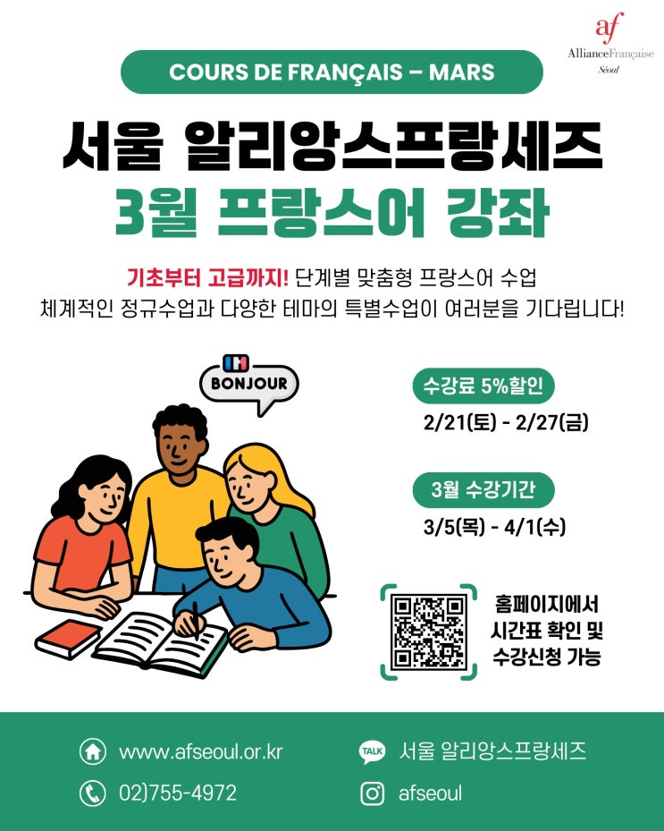 다양한 정규수업과 특별수업들이 여러분을 기다리고 있으니, 자세한 시간표는 서울 알리앙스프랑세즈 홈페이지에서 확인해 주세요. ▶5% 할인기간 : 2/21(토) - 2/27(금) ▶3월 수강기간 : 3/5(목) - 4/1(수) ——— ✅서울알리앙스프랑세즈 홈페이지 및 네이버 카페에서 24시간 온라인 등록 가능합니다. ✅문의사항은 ’서울 알리앙스프랑세즈‘ 카카오톡 채널 또는 02)755-4972로 문의주시기 바랍니다. ⬇3월 온라인 수강신청 바로가기 <img src="https://blogthumb.pstatic.net/MjAyNjAyMjVfNzIg/MDAxNzcxOTgyMjI3MzE5.bagfrDJ67pFO94dOh-APSx7vHglgSwxURnoSG25BKEkg.Tzt2sYqw6WW4hlyRKvOqIGFDWttitaw8GwO__ZPX9w8g.JPEG/KakaoTalk_20260225_100113920.jpg?type=s3" />