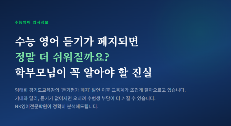 Issue 01 지금 교육계에서 무슨 일이 벌어지고 있나요 지난 2025년 11월, 2026학년도 수능 당일 임태희 경기도교육감이 공개적으로 "수능 영어 듣기평가를 폐지하겠다"고 선언했습니다. 이 발언 하나가 해를 넘긴 2026년 2월인 지금까지도 교육 현장을 뜨겁게 달구고 있습니다. 폐지 주장의 배경에는 매년 수능일마다 반복되는 문제들이 있습니다. 항공기 이착륙 통제, 고사장별 스피커 성능 차이로 인한 형평성 논란, 그리고 실제로 청주의 한 고사장에서는 스피커가 작동하지 않아 CD플레이어를 긴급 투입하는 방송 사고까지 발생했습니다. 이러한 행정적 문제 제기 자체는 일리가 있습니다. 그러나 학부모님들이 정작 알아야 할 것....... <img src="https://blogthumb.pstatic.net/MjAyNjAyMjVfMTg3/MDAxNzcxOTk4NDYyODE1.VqkejqZm8NM-gagqydSwOjJuHuAaWDYwvTWTEBvqfScg.keO7CS3VFncAddC0tBtaT-icPhwQYKy2QIMe753lBjQg.PNG/image.png?type=s3" />