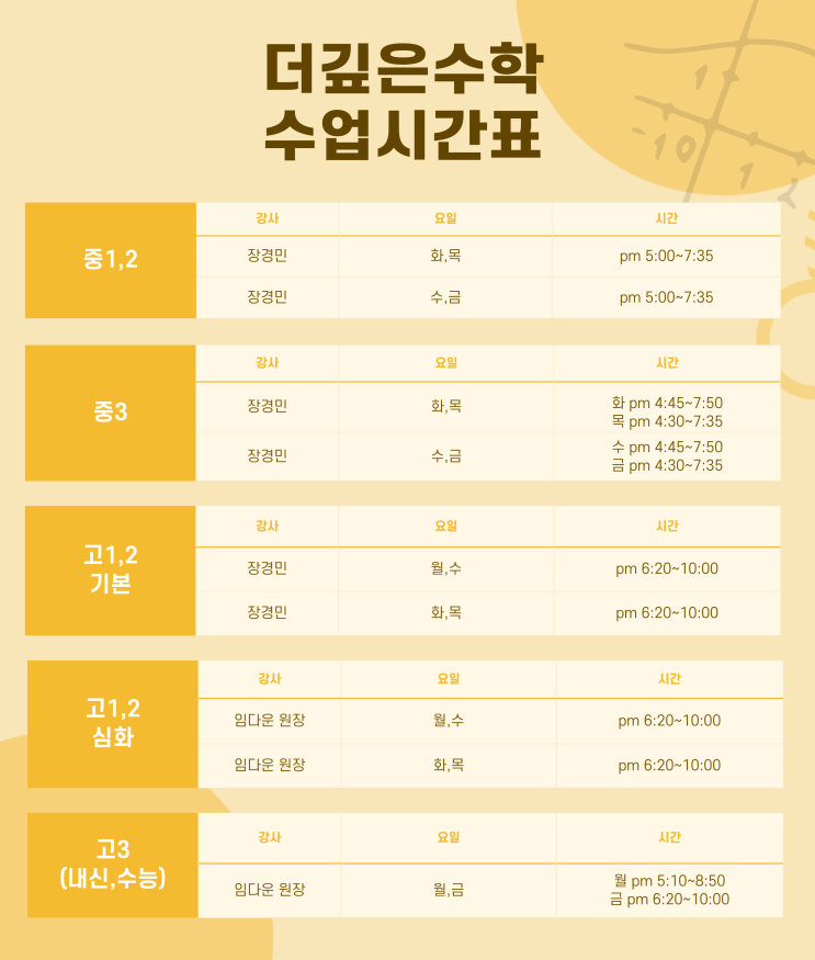 안녕하세요 일산 탄현동 중고등전문 수학학원, 더 깊은수학입니다. 26년 1학기 시간표 공지드립니다:) 중1,2학년-화목/수금 5:00~7:35 중3학년-화목/수금 화/수 4:45~7:50, 목/금 4:30~7:35 고1,2학년(기본/심화)-월수/화목 6:20~10:00 고3학년-월금 월 5:10~8:50, 금6:20~10:00 학원 오픈시간 월~금 4:30~10:00 올해부터는 보다 전문적인 수업을 위해 새로운 강사님을 모셨습니다! 강사님은 수학교육학과를 졸업하신 교원자격증 소지자이고, 후곡백마 학원가에서 중고등부를 가르친 경력이 10년이상인 전문강사님이십니다. 강사 장경민 수학교육학과 졸업(교원자격증 소지) 후곡 백마 학원가 중고등부 경력 10년 이상 일타수학학원 스....... <img src="https://blogthumb.pstatic.net/MjAyNjAzMDdfMjI3/MDAxNzcyODgzMjMzNzE3.P5dCw83CPs1WQF1uyruCImaVHiDUK1WtNA3Bgs5FpfEg.ItC25rAks2nROBAtzvbCEnZ12-aMKDjbhyUUTmTVlngg.PNG/26%B3%E2_1%C7%D0%B1%E2_%BD%C3%B0%A3%C7%A5.png?type=s3" />