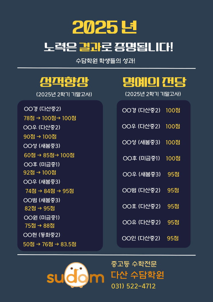 학원을 운영하다 보면 “정말 성적이 오르나요?” 라는 질문을 가장 많이 받습니다. 그래서 말 대신 결과로만 정리해봅니다. 2025년 2학기 기말고사, 수담학원 학생들의 실제 성적 변화입니다. 기말고사 성적 향상 사례 한 번의 시험이 아니라 누적된 변화 위주로 정리했습니다. 78점에서 시작해 두 번 연속 100점 60점대에서 85점을 거쳐 100점 74점에서 84점, 이후 95점 50점대에서 70점대 중반, 이후 80점대 70점대에서 80점대 후반 80점대에서 95점까지 상승 단기간 요령이 아니라 기본 개념 이해와 반복 훈련을 통해 만들어진 결과입니다. 100점과 95점 이상 성적 이번 기말고사에서는 100점과 95점 이상 고득점자도 다수 나왔습니다. 학교....... <img src="https://blogthumb.pstatic.net/MjAyNTEyMjJfMTk5/MDAxNzY2MzMzMTMxNDYw.U-tZBIq7yd48_XdaJv63x-uCO5QcHgyZxdZuOYTqI-Ig.iUS9KUUn4MckbPIe7lDGK13BRzpcKGidD8cShj6pJ4Mg.PNG/image.png?type=s3" />