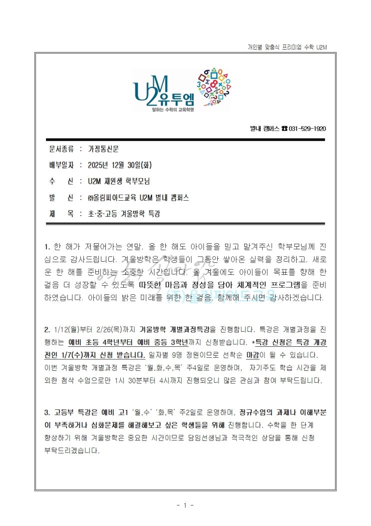 아이의 ‘다음 단계’를 준비하는 가장 중요한 시간 안녕하세요. 별내 유투엠(U2M)입니다. 한 해가 저물어가는 연말, 학부모님들께서 가장 많이 고민하시는 시기이기도 합니다. “이번 겨울방학, 아이의 수학 실력을 어떻게 끌어올려야 할까요?” 겨울방학은 단순히 쉬는 시간이 아니라 그동안 쌓아온 학습을 정리하고, 다음 학년을 준비할 수 있는 가장 중요한 골든타임입니다. 별내유투엠에서는 아이의 현재 수준과 학습 태도에 맞춘 겨울방학 맞춤 특강 프로그램을 준비했습니다. ✏️ 1. 초·중등 개별과정 특강 단기간에 끝내는 특강이 아닌, 아이의 속도에 맞춘 학습 별내유투엠의 개별과정 특강은 단순히 방학 동안 진도를 많이 나가는 수....... <img src="https://blogthumb.pstatic.net/MjAyNjAxMDdfMTYy/MDAxNzY3NzgwMzU4MjA5.QSPayxwH_Ob_iNhFp4f17At-FsStA1stlVbyydsRF4gg.vzv9yywP3rkT-Hn8J80E1ps0vEXOXGX_cdNQBL4sRj0g.JPEG/2025%B3%E2_12%BF%F9_%B0%DC%BF%EF%B9%E6%C7%D0_%C6%AF%B0%AD001.jpg?type=s3" />
