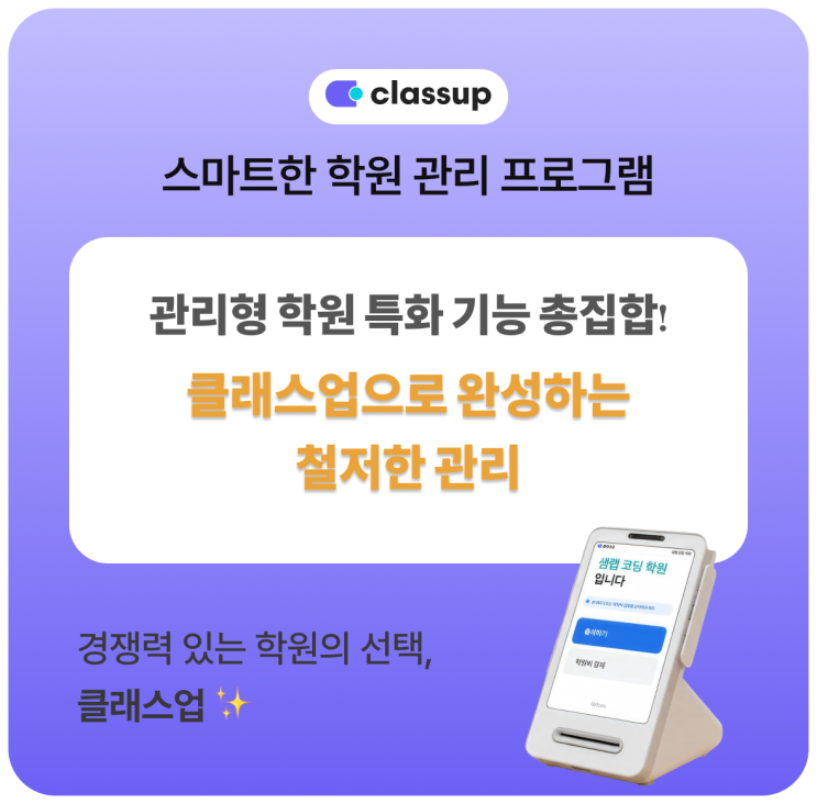 안녕하세요, 스마트한 학원 운영의 동반자 클래스업입니다. 3월 새학기가 시작되면서 학원가는 벌써 2027학년도 수능을 향한 레이스에 들어갔습니다. 특히 학생의 학습 태도와 생활 패턴까지 꼼꼼하게 관리해야 하는 관리형 학원이나 독서실 원장님들께서는 요즘 운영 시스템에 대해 더 많이 고민하고 계실 시기일 것 같아요. 이제는 단순히 출결만 체크하는 시대가 아닙니다. 요즘 학부모님들은 단순히 “학원에 갔는지”보다 우리 아이가 자리에 앉아 있는지 실제로 공부에 몰입하고 있는지 혹시 잦은 외출로 집중력이 흐트러지고 있지는 않은지 이런 부분까지 궁금해하시는 경우가 많습니다. 이런 요구를 충족하면서도 원장님의 운영 부담을 줄....... <img src="https://blogthumb.pstatic.net/MjAyNjAzMDVfNTkg/MDAxNzcyNjY5MDM5MjU5.dq0OhM57m0JuJBtRI3ljt51TwwyS7NpfJ4hcZ1bZcY4g.thuvfFWtLnW9yI52-GYa4aI-KafpbFnRdKDDYessCdog.PNG/%C5%E4%BD%BAx%C5%AC%B7%A1%BD%BA%BE%F7_%2811%29.png?type=s3" />