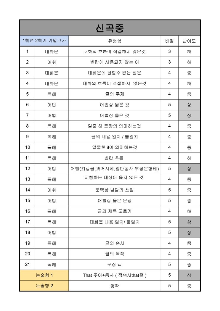 신곡중/고촌중 1-2 기말고사 영어 시험분석