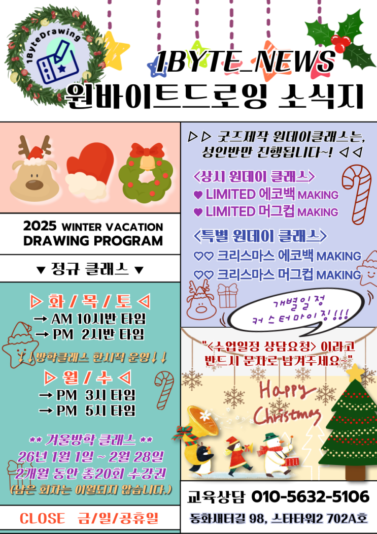 *** 벌써 겨울방학 이라구?! 추운데 뭐해~~ 드로잉이나 하자♡♡♡ ↓ ↓ ↓ 오픈채팅 QR ↓ ↓ ↓ 원바이트드로잉 010-5632-5106 <img src="https://blogthumb.pstatic.net/MjAyNTExMjJfMTA5/MDAxNzYzNzkyMjU2MjM3.kFCfIeyaLH3xnc1U1oOsBJYjUIqNfv-SbRCgGkg3C2Ig.Kbpnommdhh0425pzsL9eCqF1hcJjumyvTENScxeQCkcg.PNG/2025_%C7%CF%B9%DD%B1%E2_%BC%F6%BE%F7_%BA%B9%BB%E7%BA%BB-001.png?type=s3" />