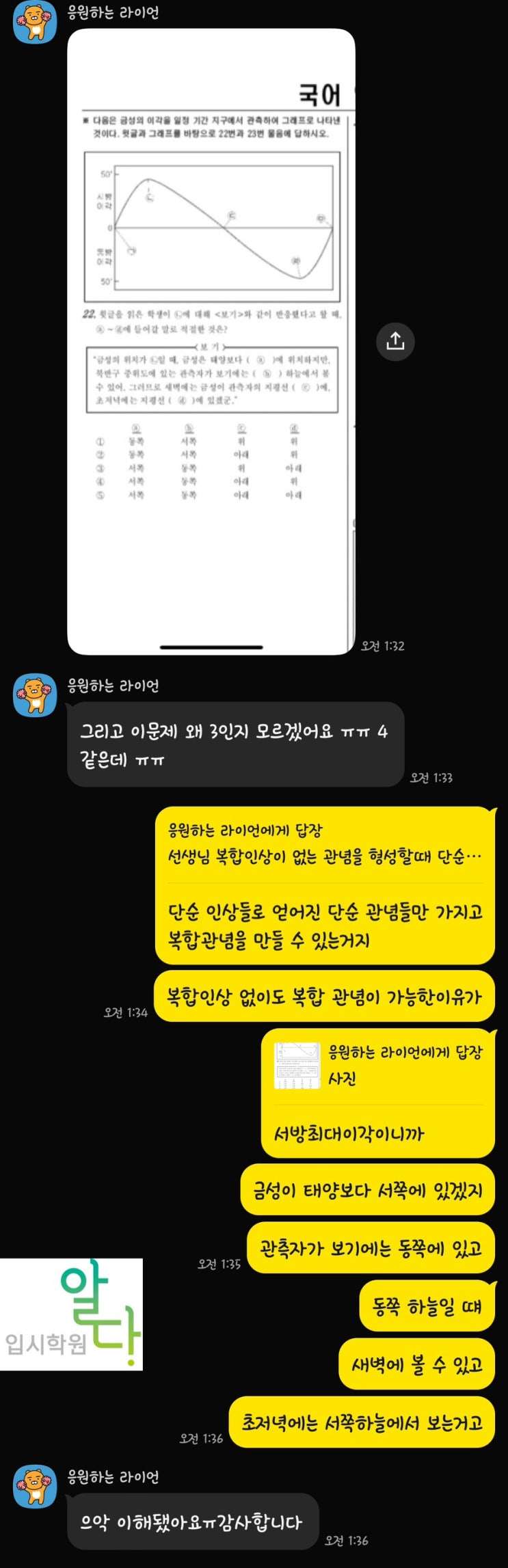 서연고 국어 시험 어떻게 공부하는 것이 가장 효과적일까? 어떻게 하면 아이들이 조금 더 쉽게 국어에 접근할 수 있을까? 이런 많은 고민을 하며 아이들과 함께 기말고사를 준비했습니다. 이번 시험범위를 아이들이 유독 어려워해서 시험 직전 수업 시간만 8시간.. 아이들이 선생님께 질문하느라 곁에서 떨어지지를 못하더라고요. 집에서도 톡으로 질문이 쏟아지고,.. 어려워하면서도 조금이라도 더 공부하겠다는 모습에 선생님도 아이들도 정말 전력질주했던 시험 기간이었습니다. 톡으로 질문하는 아이들의 모습니다. 새벽 1:30분이 훌쩍 넘은 시간 아이들도, 선생님도 밤잠을 이루지 못하고 최선을 다하는 모습! 간절한 마음을 알아준 걸....... <img src="https://blogthumb.pstatic.net/MjAyNTEyMThfMjQ4/MDAxNzY2MDU5MjY5MDA1.Y46SAhtX5IkOkdaBaZWO3Gf8OJPbQCElQuEcjF0y_qAg.juGwrQkiqcECviW29BJDRdgrvw3p6SkYMkQchxBw1HAg.JPEG/IMG%A3%DF2291.JPG?type=s3" />