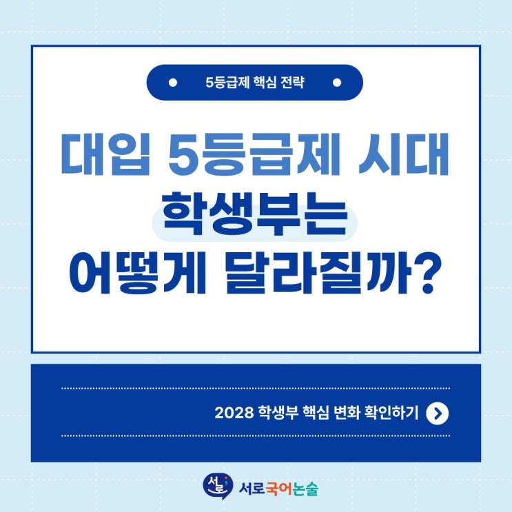 안녕하세요 동탄5동 지역에서 국어 학습과 학생부 흐름을 함께 지도하고 있는 동탄5동 국어 학원, 서로국어논술입니다. 최근 2028 대입 개편과 함께 내신 5등급제 시행이 본격적으로 언급되면서 동탄5동 지역 학부모와 학생들 사이에서도 불안과 혼란이 동시에 커지고 있습니다. 1등급을 놓치면 서울권 진학이 어려운 것은 아닌지 2등급이 나오면 전략을 바꿔야 하는 것은 아닌지 심지어 자퇴나 정시 전환을 고민하는 경우도 현장에서 실제로 늘어나고 있습니다. 이번 글에서는 현직 교사의 현장 경험을 바탕으로 정리된 2028 대입 5등급제의 핵심 변화와 학생과 학부모가 꼭 이해해야 할 입시 흐름을 동탄5동국어학원 관점에서 차분하게 정....... <img src="https://blogthumb.pstatic.net/MjAyNTEyMThfMjY0/MDAxNzY2MDI2NDkzMjU2.xSfNRKC5nS3hCJZ8lrquTj5elGAVb1GC3TmApIv2Qlwg.W64n12prbYLoBbQzt-2b7c9mfxgNpsk2LuAa1b35N7Ug.JPEG/1.jpg?type=s3" />
