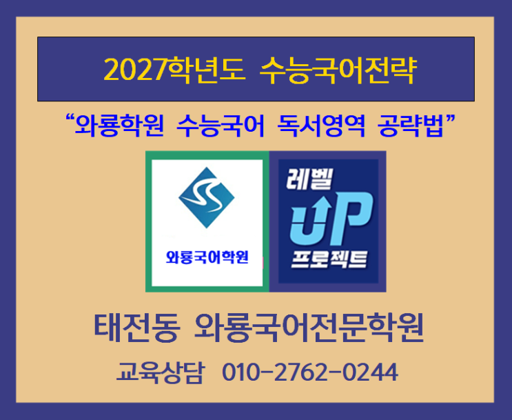 태전동 와룡국어전문학원 【수능국어 독서지문 공략법】 【독서영역 만점은 독해력이 좌우한다】 수능독서영역은 낯선 제시문을 바탕으로 고난이도 문제 위주로 출제되기 때문에 문학에 비해서 정답률이 현저히 떨어지며 국어 등급을 깎아 내리는 주된 영역입니다. 그래서, 수능국어를 잘 한다는 학생들도 독서영역 만큼은 어렵게 느끼고 있습니다. 독서지문에 대한 이해력과 분석력을 함양하고 단기간에 수능국어 등급을 올리기 위해서라도 독서지문 [독해법]은 반드시 배워야 할 것입니다. 지문 독해법을 알면 독해능력이 향상되고 동시에 독해능력이 향상되면 분석력과 이해력도 연달아 향상되는 것이 독해법의 원리입니다. 많은 학생들이 독....... <img src="https://blogthumb.pstatic.net/MjAyNjAyMjVfMjQ5/MDAxNzcxOTkwMzMwNDM1.d3niGew6W253ub0FtXNkkS-gyQh6iQJaZpJVFpPb93Qg.EYtBtiHjIN4FmyiMPw4G3DjuLCLwcRy5Ce1opjGkNOog.PNG/%BF%CD%B7%E6%C7%A5%C1%F6.png?type=s3" />