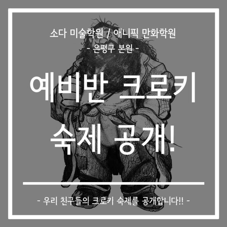 안녕하세요! 서울 구파발 미술학원 은평 중고등 애니 학원 소다 미술힉원 / 애니픽 만화 학원입니다~~ 어느덧 3월이 다가오고 있는데요~ 다들 잘 지내고 계시나요? 곧 새 학기도 시작이 되는데 남은 방학 알차게 보내기를 바랍니다♥♥ 오늘 공개할 그림은 <예비반 크로키 숙제>입니다. 항상 숙제를 열심히 해오는 우리 친구들인데요~~ 같이 우리 친구의 숙제를 보며 어떻게 숙제를 해야 도움이 되는지! 한 번 살펴봅시다~~ 실사 위주의 숙제입니다~! 실제 사람을 기반으로 하는 자료이기 때문에 인체 동세가 더욱 돋보이는데요~ 역동적인 자세를 잘 그려주었습니다. 실사를 잘 그린다면 다양한 그림체 소화할 때도 도움이 될 것 같아요. 다....... <img src="https://blogthumb.pstatic.net/MjAyNjAyMjNfNjAg/MDAxNzcxODI1NzY5NzUx.RBeUylat4HwckGDJd5e19ENtinuAATzT_y13dfs04hEg.ob-RihAetPoqtUijGxoXKUcMzXTpU0QEBy-WpuA7U8kg.JPEG/0223_%B4%EB%C7%A5%C0%CC%B9%CC%C1%F6.jpg?type=s3" />