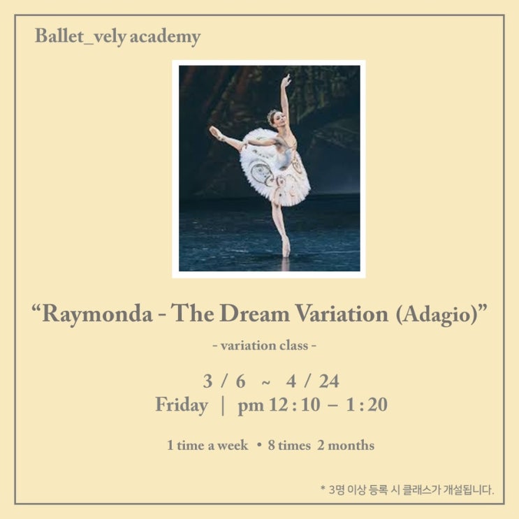 ‘레이몬다 아다지오‘ 매 주 금요일 pm 12:10 두 달간 8회 진행 • 쿠폰 클래스 / 두 달 예약제 입니다. • 쿠폰은 월 초에 8회가 차감 됩니다. (별도의 어플 예약 없이 수강) • 수강권의 기간은 2주 이상 남아있어야 등록 가능합니다. (2주 - 4회까지 차감 가능, 4주 - 7회 차감 ) • 결석 시 두 달간 2회에 한하여 쿠폰 2회 반환됩니다. (당일 결석 통보는 노쇼 처리되며, 최소 1일 전 결석에 대해 연락 주셔야 가능합니다.) • 바 워크 후 바리에이션 클래스 진행됩니다. • 우지연 선생님 클래스 • 토슈즈 착용 가능 ️ 상담 및 등록 문의 카카오톡 채널 "발레블리" 네이버 톡톡 문의 010.9201.1777 / 02.6369.177....... <img src="https://blogthumb.pstatic.net/MjAyNjAyMTlfNDAg/MDAxNzcxNDcyOTU1NTk0.0nv19tl6NY3PBiehocTDfFRyTcoq8yJBJ5QkRaOzaZIg.vGUznyjpJsyoTsZHiwt8WPIxnVGH4frae4MpTTUV5Rwg.JPEG/IMG%A3%DF2723.JPG?type=s3" />