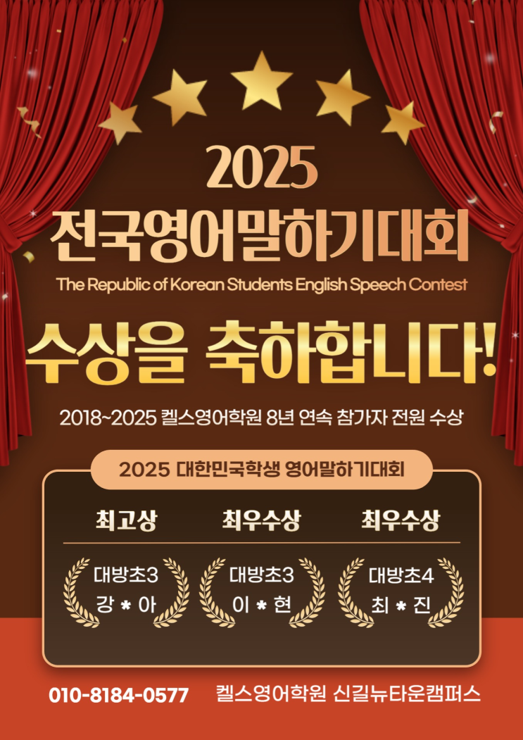 안녕하세요. 신길동 영어학원 KELS English입니다♡ 지난 2025년 11월 30일, 상명대학교 아트센터에서 대한민국 학생 영어말하기가 개최되었습니다. 켈스 신길뉴타운캠퍼스에서는 이번 대회가 첫 참가였는데요, 이번에 참가한 세 명의 친구들 모두 인생 첫 영어학원으로 켈스를 선택해 영어를 시작한 학생들이었답니다.^^ 알파벳, 파닉스부터 차근차근 시작해 약 1년 2~3개월만에 이렇게 큰 무대에서 실력을 당당히 보여주고, 첫 말하기 대회에서 수상까지 한 우리 켈스 학생들!!!! 아주 멋져요♡♡ 약 한 달동안 스크립트 암기와, 유창한 발음, 정확한 혀 위치와 자연스러운 억양을 저와 함께 연습, 연습 또 연습!!했어요. 교정기때문에 정확한....... <img src="https://blogthumb.pstatic.net/MjAyNTEyMTZfNTEg/MDAxNzY1ODY0OTM2MTg2.9ltuDZN7Wcct4x7-YkGedK5gI5zzFXZo7u1WnJ465zQg.k1yADsCBLZJVh7EleIR1rNBDybMmZ0SdPDRSsedR6pIg.PNG/2025_%B8%BB%C7%CF%B1%E2%B4%EB%C8%B8_%BC%F6%BB%F3_%C6%F7%BD%BA%C5%CD.png?type=s3" />