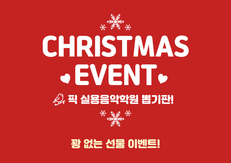 안녕하세요! 픽 실용음악학원입니다. 크리스마스 이벤트로 꽝 없는 뽑기 이벤트를 준비하였습니다~!! 1등은 무려 수강료 30%할인 혜택이 있습니다!! 연말을 즐겁고 따듯하게 마무리하기 위해 준비한 이벤트로 많은 참여 부탁드립니다 또한 이번주 등록하시는 신규 수강생분들도 참여 가능하오니 이번 기회에 수강료 할인에 도전해보시는건 어떨까요? 감사합니다 <img src="https://blogthumb.pstatic.net/MjAyNTEyMThfNTEg/MDAxNzY2MDQ3OTc3OTM3.C_X2Y-OGIwwq2XZQCKzsQphO1pX80CcOhhkDrKToKcAg.FU5eW3NaykAERgbenxdeyV51QyAg5SO6YBhnB7FzTyog.PNG/%C1%A6%B8%F1%C0%BB_%C0%D4%B7%C2%C7%D8%C1%D6%BC%BC%BF%E4._%281%29.png?type=s3" />