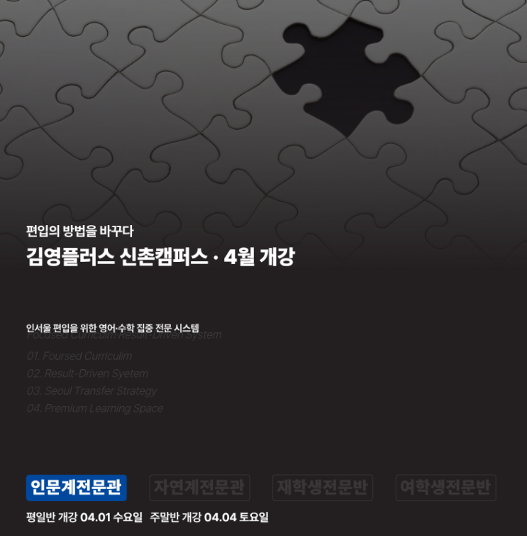 안녕하세요. 서대문 마포 은평 홍대 신촌 김영편입 신촌 플러스 + 김영플러스 신촌캠퍼스입니다. 김플신촌의 인문계 전문관의 4월 개강 안내드립니다. 인문계전문관 자연계전문관 재학생전문반 여학생전문반 평일반 4월 1일 수요일 개강 주말반 4월 4일 토요일 개강 편입에는 공인영어, 논술, 전공필기를 포함한 다양한 전형이 있지만 대부분의 학생들이 편입영어, 수학 전형으로 준비하는 이유는 대부분 학교의 전형이 편입영어, 수학으로 진행되기 때문이죠. 편입공부 시작, 혼자 하지 마세요 김영플러스 신촌캠퍼스는 학생을 위한 편입공부 특별관리 시스템으로 공부부터 관리까지 한 번에 도와드립니다. 담임선생님 관리....... <img src="https://blogthumb.pstatic.net/MjAyNjAzMTFfMjYg/MDAxNzczMjAxNzg5MzMy.wp0PiBOvBhR96ubwQ85XQVQrSoglRrUZnIKWL5tqZUAg.Unu76R4cRRmq9w_OE3t921PhaLrWee_q0rXVwrgWl5og.PNG/1.png?type=s3" />