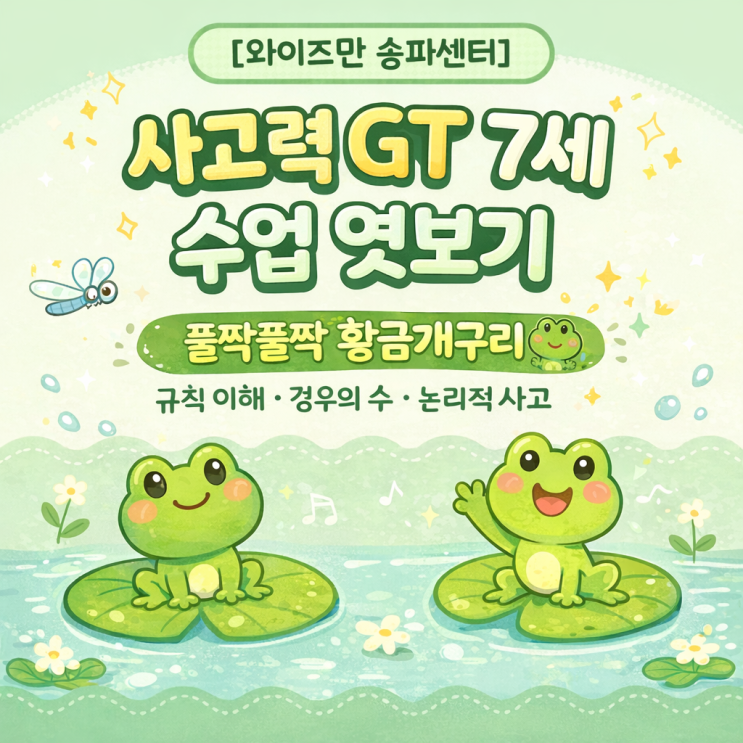 안녕하세요. 와이즈만 송파센터입니다 오늘은 사고력 GT 7세 수업 중 아이들이 정말 재미있어하는 활동을 소개해드릴게요! 풀짝풀짝 황금개구리 연못 위를 점프하는 황금개구리! 하지만 그냥 뛰는 것이 아닙니다. 규칙을 지키며 이동해야 하는 사고력 미션입니다. 수업 목표 ✔ 가능한 경우를 하나씩 직접 확인하며 문제 해결하기 ✔ 주어진 규칙을 이해하고 논리적으로 사고하기 ✔ 순서를 예측하고 이유를 설명하기 단순한 놀이처럼 보이지만, 사실은 경우의 수 + 규칙 이해 + 추론 능력을 함께 키우는 활동입니다. 어떤 활동을 할까요? 1️⃣ 규칙 이해하기 황금개구리는 다른 개구리 한 마리를 뛰어넘어 이동 한 방향으로....... <img src="https://blogthumb.pstatic.net/MjAyNjAyMjZfMTM4/MDAxNzcyMTA2MTgxMTQy.P-EPKUAb3EXdpwf8cvQ6xZmsj8h0v3I2MyzD-lKTefQg.RkyHOu0KTtpoy-PiqP01y2J6yOSjo1pHe42tIBsxF6Mg.PNG/GT7%BC%BC.png?type=s3" />