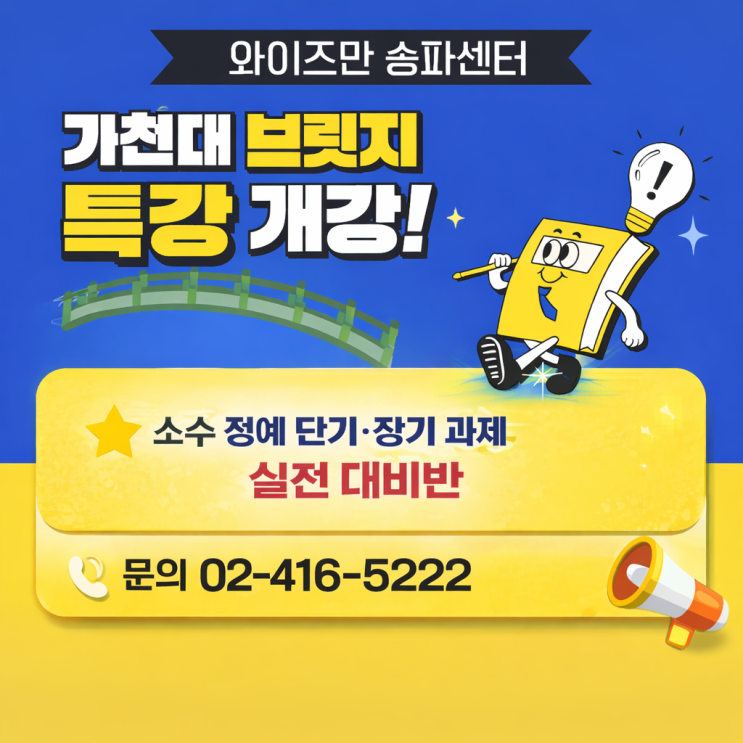 안녕하세요 와이즈만 송파센터입니다. 2026학년도 가천대학교 과학영재교육원 브릿지전형을 준비하는 학생들을 위한 실전 대비 특강을 안내드립니다. 가천대학교 과학영재교육원 브릿지전형 대비 특강 개강! 브릿지전형은 관찰수업 대상자 선발을 위한 장·단기 과제 수행 능력이 매우 중요합니다. 단순한 문제풀이가 아니라, ✔ 주어진 과제를 정확히 이해하는 힘 ✔ 탐구 과정을 구조화하는 능력 ✔ 논리적으로 정리하고 표현하는 역량 이 핵심입니다. 와이즈만 송파센터에서는 실제 과제 유형에 맞춘 실전 완성형 특강으로 브릿지전형을 체계적으로 대비합니다. 브릿지전형 주요 일정 원서접수 : 2/25(수) 9:00 ~ 3/13(금) 17:0....... <img src="https://blogthumb.pstatic.net/MjAyNjAyMjhfMjgw/MDAxNzcyMjY1NDExMzcz.uPbH20zkUdOlFEowbVqNrodUc7XWiVDLTgCiPD-oX6og.KLaQP7FvFCHPAmJ-r_vJvqfpRCy8yBh6U_5XfPuXhMwg.PNG/%B0%A1%C3%B5%B4%EB_%BD%E6%B3%D7%C0%CF.png?type=s3" />