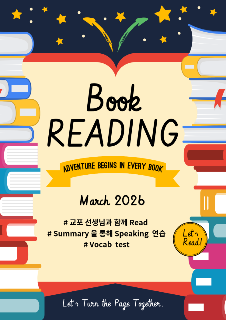 대상: G 3~7 수업: 주 1회 수요일 5:00-6:30 / 6:30-8:00 (90분) 토요일 오전 10:30-12:00 추가 Class open 가능 ! 정원: 3명 비용: 회당 5만원 (교재비 별도 / 교재 학원서 대여가능) 수업 진행 : 학생과 선생님께서 소리내어서 읽고 (발음교정) Summary 하면서 캐릭터와 background 에 대하여 나누고 vocab 확인 및 Essay 로 마무리 Book 을 통하여 Speaking Develope 하는 수업 ! 2월 G 6-7 Class -Oliver Twist G 8-9 Class - 3월 G 6-7 Class - The Great Gatsby <img src="https://blogthumb.pstatic.net/MjAyNjAzMDRfMTYz/MDAxNzcyNTk2MDc2MjUz.CiTMtJACurFhI7Oqs_gMsh_zDnjqC-ZmGwgRpYfbGFMg.rZ4RGrK1pOx_qEV24aBEoD06XgTXmqgXtRiUxoOrZYUg.PNG/%C1%A6%B8%F1%C0%BB_%C0%D4%B7%C2%C7%D8%C1%D6%BC%BC%BF%E4._%284%29.png?type=s3" />