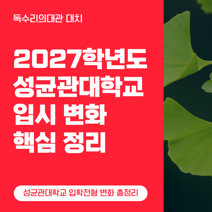 안녕하세요, 학생의 꿈을 현실로 만드는 독수리의대관입니다! 성균관대학교 2027학년도 전형 계획 다들 보셨나요? 이번 개편은 단순한 인원 조정을 넘어 "공부 잘하는 학생을 수시와 정시 어디에서든 뽑겠다"는 강력한 의지가 담겨 있습니다! 그 변화의 파도를 기회로 바꿀 핵심 포인트를 공개합니다. 1. 학생부종합(융합인재) 전형, '수능 최저'라는 거대한 장벽 가장 주목해야 할 변화는 기존에 수능 최저 학력 기준이 없었던 학생부종합(융합인재) 전형에 수능 최저가 도입된 것입니다! 수능 최저 학력 기준 : 국/수/영/탐 중 3개 영역 등급 합 6등급 이내. 영향 : 이는 비메디컬 학종 중 최상위 수준의 기준으로, 서류 준....... <img src="https://blogthumb.pstatic.net/MjAyNjAzMDFfMjQ0/MDAxNzcyMzY5OTA4NTA0.rz0Wm4z8kPQUyr903lF0LaO1FSb9kNbs8KeTeJfHvScg._LD2WWuD2AswUGfu8UdPPSddO1odVwBXNxzMp24VMEAg.PNG/%C1%A6%B8%F1%C0%BB_%C0%D4%B7%C2%C7%D8%C1%D6%BC%BC%BF%E4._%286%29.png?type=s3" />