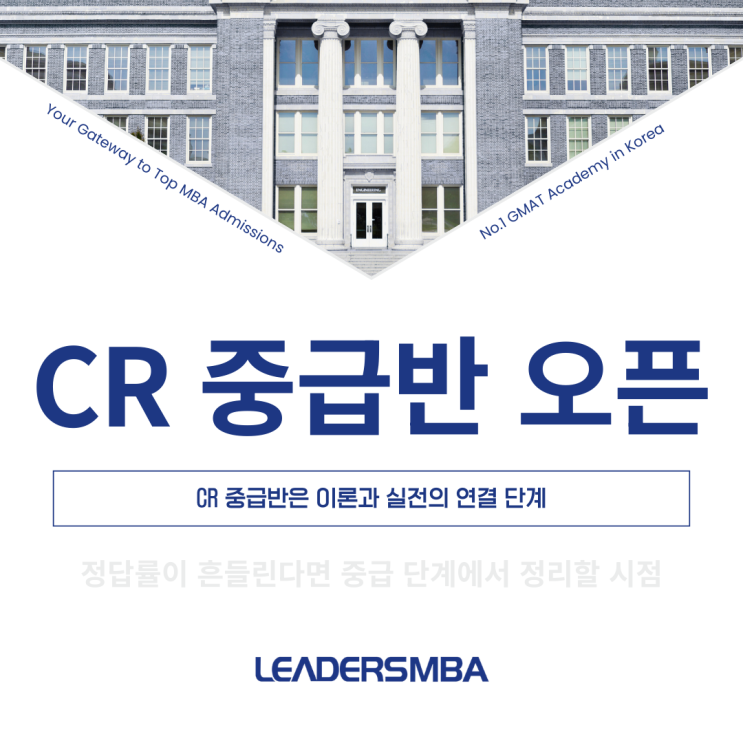 gmat 학원 리더스MBA CR 중급반 오픈 Focus GMAT 체제로 시험이 개편되면서 CR의 체감 난이도는 오히려 높아졌습니다. 문항 수는 줄었지만 한 문제의 점수 영향력은 더 커졌습니다. 이제 CR은 감이 아니라 구조입니다. 리더스MBA에서 CR 중급반이 새롭게 오픈됩니다. gmat 학원 리더스MBA의 이번 과정은 실전 완성을 목표로 한 집중형 프로그램입니다. 왜 CR 중급반이 필요한가 이론을 들었는데 점수가 오르지 않는다면 문제는 적용 단계입니다. 유형은 알지만 실전에서 흔들리고 특정 문제에서 반복 실수한다면 구조 이해가 완성되지 않은 상태입니다. Focus GMAT은 한 문제의 실수가 퍼센타일을 가릅니다. 따라서 실전형 사고 훈련이 필수입니....... <img src="https://blogthumb.pstatic.net/MjAyNjAyMjNfNDEg/MDAxNzcxODIwODMxNDQ5.-rlvIA8CeU3uw0MLB-iZEzTKkWvErIk9UEBLDEQz1G8g.bDNcV6fatjrrXWRdIdzsCXqXwYrKvL2C_tg8K-cZN5Mg.PNG/1.png?type=s3" />