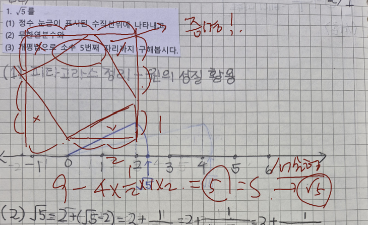 수학과학등독서탐구 수업에서 주제도서 #허수 <승산> 는 수체계에서 다양한 수에 대해서 문학적(?)으로 다루고 있습니다. 그 중 무리수에 대해 다양한 수학적인 표현방법을 다루어보았는데 그 사례로 제곱근을 다루고 있습니다. 보통 제곱근은 그 근삿값이 유한소수로 표현되지않기에 제곱근(루트)라는 특별한 기호를 써서 나타내는데 이는 계산이 편하긴 하지만, 직관적이지 않습니다. 그래서 다른 방법으로 표현해보면 좋습니다. 첫째 제곱근 5는 넓이가 5인 정사각형의 한변으로 다루고, 이를 수직선 위에 나타낼수 있습니다. (여기서 주의! 피타고라스 정리를 쓰면 또 다른 공식을 쓰는거니 안되겠죠) 두번째는 무한연분수로 나타낼수....... <img src="https://blogthumb.pstatic.net/MjAyNjAyMThfNjAg/MDAxNzcxNDA0NzAwODUy.9DzmD9m3RMXqBtP-FOblwKoZD24EEBwGYdiQugvzlUkg.ljR2HmkouyIuLNPx8OpvF3T_i9ZWTUOYK_km01FlRWMg.PNG/%B9%AB%B8%AE%BC%F6_01.png?type=s3" />