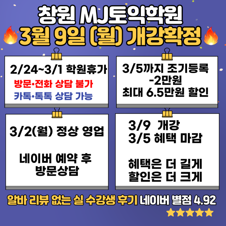 안녕하세요. MJ어학원 MJ샘입니다. 학원 휴가 안내를 드리고자 포스팅 합니다. 2/24 ~ 3/1 학원 휴가 해당 기간 방문 및 전화 상담은 불가하오니 양해 부탁드립니다. 카카오톡 · 네이버 톡톡 상담은 상시 가능합니다. 문의 주시면 상세히 안내드리겠습니다. 카카오톡 상담 : https://open.kakao.com/o/sNTpgWOf 네이버 톡톡 상담 : https://talk.naver.com/ 3월 9일(월) 개강 확정 ✔ 3/5까지 조기등록 -2만원 ✔ 최대 6.5만원 할인 적용 ✔ 혜택은 더 길게, 할인은 더 크게 타 학원은 3월 초 개강이 많지만, MJ어학원은 3월 9일 개강입니다. 조기등록 혜택은 3월 5일 마감입니다. 비교 후 선택하셔도 늦지 않습니다. 3....... <img src="https://blogthumb.pstatic.net/MjAyNjAyMjNfMjI4/MDAxNzcxODQzNzE1MTkw.r8nVkAYX9dNV2L0Rh_GEHNJH9z-tW0uRQvJtcDpeGcog.GAvEg7kjLlt17xDYmIteycIQ3iG4UVMMSVU30qz0oU4g.PNG/%C3%A2%BF%F8%C5%E4%C0%CD_MJ%BE%EE%C7%D0%BF%F8_3%BF%F9_%B0%B3%B0%AD%BE%C8%B3%BB.png?type=s3" />