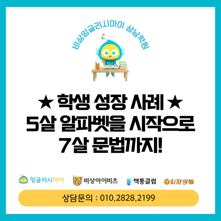 상남동 영어학원, 유아 유치부 파닉스에서 문법까지 성장한 친구 이야기 ♥ 안녕하세요, 잉글리시아이 상남점 교육사업 30년 경력의 노은경 원장입니다. ^^ 오늘은 5살 겨울에 저희 학원에서 알파벳부터 시작해서 약 2년 만에 영어 문법 과정까지 입문한 A 학생의 성장 이야기를 소개해드리려 합니다~! A학생, 잉글리시아이 상남점을 만나다 지금은 씩씩하게 영어 문장을 술술 읽어내는 우리 친구는 처음부터 그랬던 건 물론 아니었어요 A 학생이 처음 어머님과 함께 학원 문을 두드린 건 5살 겨울이었습니다. 알파벳도 낯설고, 영어라는 언어 자체가 완전히 새로운 세계였을거에요.^^ 한글과 영어, 두 언어를 동시에 익혀야 하는 여정의 시작이....... <img src="https://blogthumb.pstatic.net/MjAyNjAyMjVfMjg2/MDAxNzcyMDA5NzAzMzc1.M5YL6UeiYVNUtyY6P3A3OXXE4z9uFqmNcOwmTpSntzIg.XfSpLneeZcgMuXzUWKS_lPyDMxcvTck64GcvhcbkD1Yg.PNG/%BB%F3%B3%B2%B5%BF_%C0%AF%BE%C6_%BF%B5%BE%EE_%C7%D0%BF%F8%2C_%C6%C4%B4%D0%BD%BA%BF%A1%BC%AD_%B9%AE%B9%FD%B1%EE%C1%F6_%C0%AF%C4%A1%BA%CE_%C4%A3%B1%B8%C0%C7_%BC%BA%C0%E5_%C0%CC%BE%DF%B1%E2.png?type=s3" />
