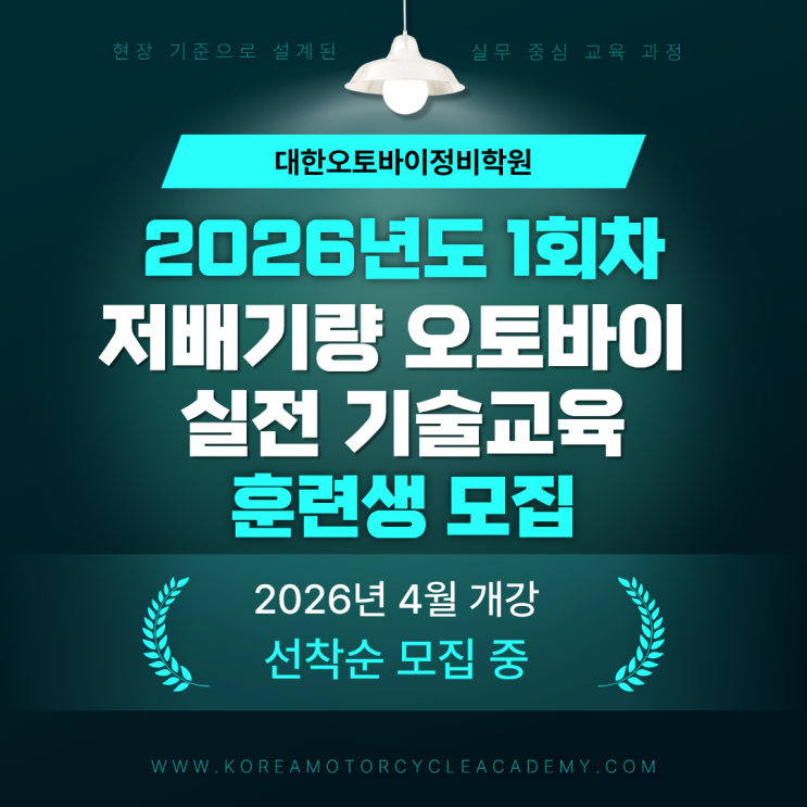 2026년, 저배기량 오토바이 정비 실전 교육이 시작됩니다 오토바이 정비는 단순한 작업이 아닙니다. 정비사는 매 순간 지금 무엇을 먼저 점검해야 하는지, 이 작업을 왜 이 순서로 해야 하는지를 판단해야 합니다. 대한오토바이정비학원의 교육은 정비를 작업이 아닌 기준과 판단의 기술로 가르치는 데서 출발합니다. 2026년 4월 개강하는 저배기량 오토바이 정비 실전 기술 교육 1회차 현재 선착순 모집 중입니다. 왜 대한오토바이정비학원이어야 할까? 기술 교육의 차이는 얼마나 많은 내용을 다루느냐가 아니라 어떤 기준으로 가르치느냐에서 갈립니다. 대한오토바이정비학원은 70여 대의 다양한 오토바이 정비 교보재와 실제 오토바이 정비 매....... <img src="https://blogthumb.pstatic.net/MjAyNjAyMjVfMjgy/MDAxNzcxOTk4MTgyNDUy.NnNdqv__9Mrr8KWSXj5i7gaDvOA8RUXREL22LKxSriAg.V3tVA3PWywQT4EsIvhR-cc4sRUSspyEc4Y09z_SQcT8g.PNG/1.png?type=s3" />