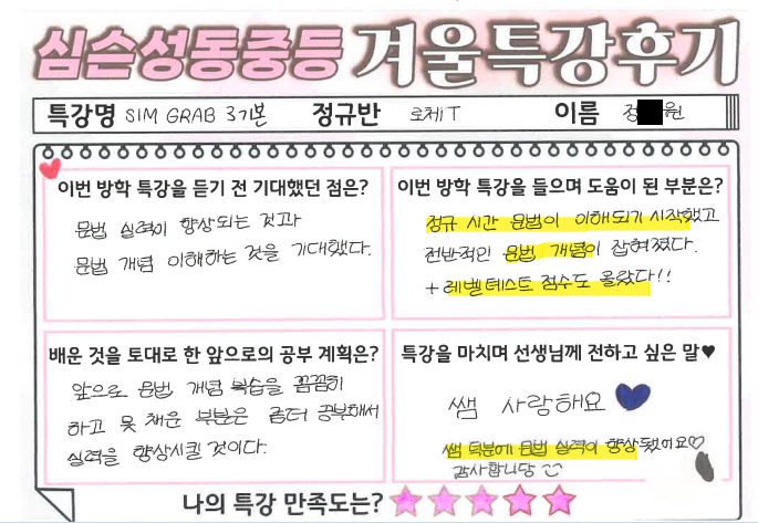 [심슨어학원 성동 중등] 중등 겨울 방학 특강 솔직 후기!
