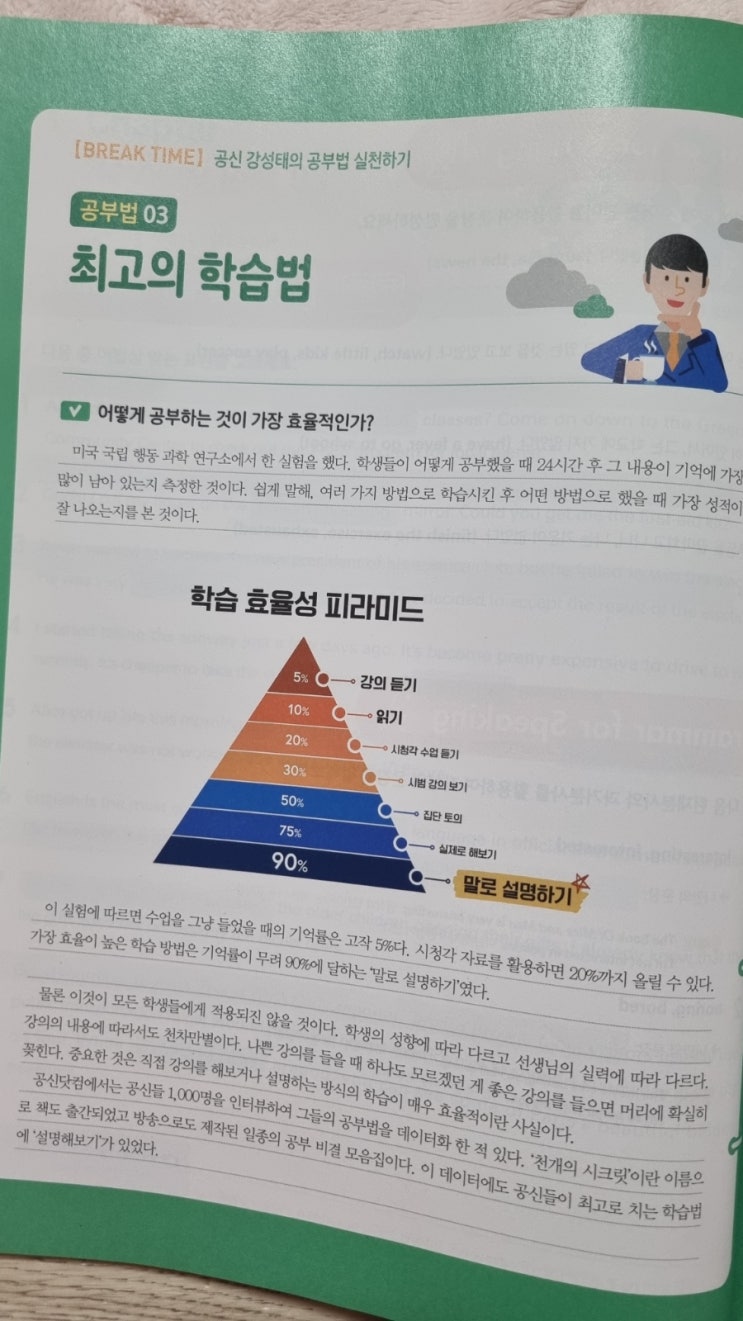 학원에서 공부하고 난 후 복습을 위해 숙제를 내주게 됩니다. 가장 공부효과가 있으려면 숙제는 어떻게 해야 할까요? 저는 우리 학생들에게 숙제를 할 때 책상 위에 인형 하나를 두고 인형에게 설명을 해주면서 문제를 풀어보라고 시킵니다. "뽀삐야~ 이 문제에서 시계 바늘 사이의 각도를 구하래. 네 시 정각으로 그려져 있으니까 엄청 쉽네~ 한바퀴가 뱅그르르 돌아가면 360도 잖아. 그걸 열두등분으로 나누면 360나누기12는 30이니까 열두등분 된 숫자 한칸이 바로 30도란 얘기지~ 그게 모두 네칸 움직였으니 30곱하기4는 120 120도 엄청 쉽지??" 위 그림에서 보듯이 가장 효율이 높은 학습 방법은 기억률이 무려 90%에 달하는 &quo....... <img src="https://blogthumb.pstatic.net/MjAyNjAyMjBfMTcw/MDAxNzcxNTYxMzg2Nzkz.8B2bhxF45gITjXdMkQQiM8DCKyzDIGWFYjr8PEbita8g.cUIHA5SfeBa_h7yQS47g3C8cckDNlFKfGk6EYYMEeAMg.JPEG/900%A3%DF20260219%A3%DF215859.jpg?type=s3" />