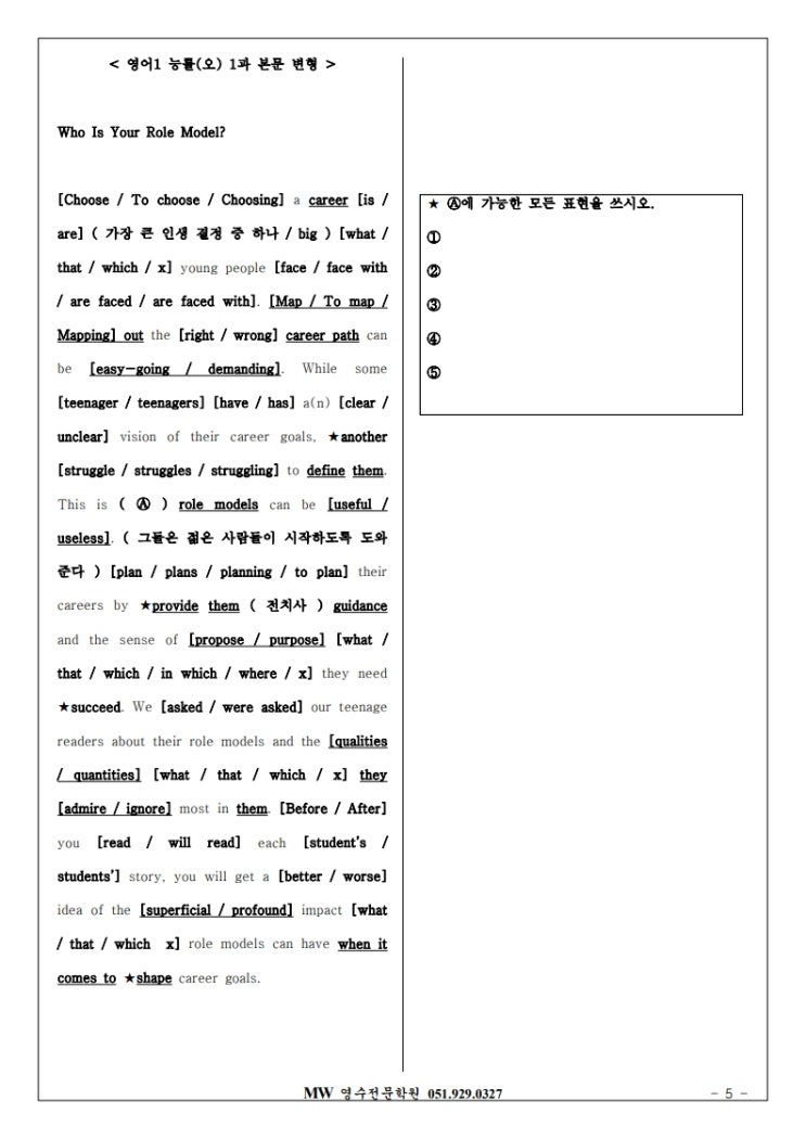 부산 동래구 명륜동 영어 엠더블유MW영수전문학원입니다. 2026년 부산 중앙여고, 사직고, 이사벨고 2학년 학생들을 위한 2022년 개정 고등 영어1 능률(오) 1과 본문변형 내신대비자료입니다. 2022년 개정 교과서이지만, 실제로 2학년들이 사용하게 될 영어1 교과서는 올해 출시가 되었습니다. 인터넷에 자료는 많이 없지만, 저희 본원에서는 100% 자체 제작 자료를 활용해서 지역 해당 학교에 최적화된 내신대비를 준비합니다. 물론 조금 시간이 지나면, 각종 인터넷사이트에 자료들이 올라오지만, 단순한 변형문제로는 학교별 세부적인 내신대비를 하기는 어렵습니다. 본원에서는 교과서뿐만 아니라, 학교별 제공되는 프린트, 부교재, 모의고사....... <img src="https://blogthumb.pstatic.net/MjAyNjAyMjFfMTU4/MDAxNzcxNjIwMzgxMjQw.Jq8-39JjrSDtxrjeva8b0hU5wTCDHZ50bQqHPdVdZa8g.EKYXdyAnLhcwXitcluyW50UtDf3j7QSn-VZK1YJ6g98g.JPEG/%BF%B5%BE%EE1_%B4%C9%B7%FC%28%BF%C0%29_1%B0%FA_%BA%BB%B9%AE%BA%AF%C7%FC_5.jpg?type=s3" />