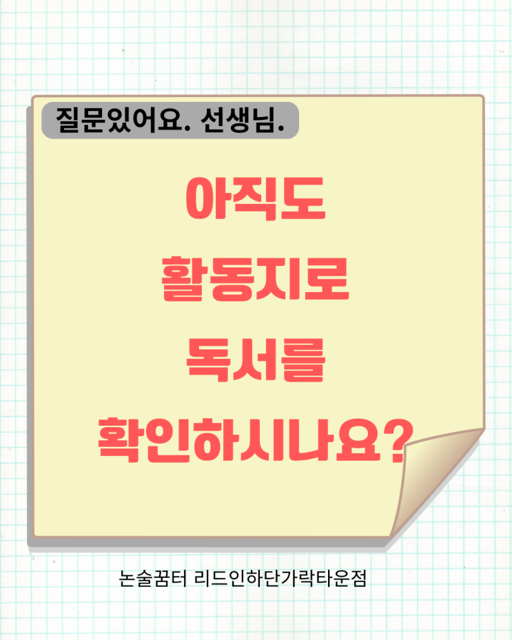Q) 아직도 활동지로 독서를 확인하시나요? 아이가 책을 제대로 읽었는지, 어떻게 확인하고 계시나요? 많은 독서 수업이 여전히 ‘활동지 완성 여부’로 독서를 판단합니다. 하지만 활동지는 ‘했는지’를 보여줄 뿐, ‘어떻게 읽었는지’까지는 말해 주지 못합니다. 활동지를 잘 채웠다고 해서 문제를 맞혔다고 해서 아이의 이해가 깊었다고 단정할 수는 없습니다. 문제는 ‘확인 방식’에 있습니다 문해력은 정답을 고르는 능력이 아닙니다. 글의 의미를 해석하고, 정보를 연결하고, 자기 생각으로 확장하는 힘입니다. 그래서 독서 지도에서 가장 중요한 질문은 이것입니다. “무엇을 했는가?”가 아니라 “이 아이는 무엇을 이해했고, 무엇을 놓....... <img src="https://blogthumb.pstatic.net/MjAyNjAxMjlfMTA3/MDAxNzY5Njc1ODYzNTU5.qxClcshUdP95Hg3JvlZMKWmrRVELbvCP7bhWETHKsKYg.7gi11nHwuZAvehu2xVz6lO-VNaHgncORK5XuPFGYh8kg.PNG/14.png?type=s3" />