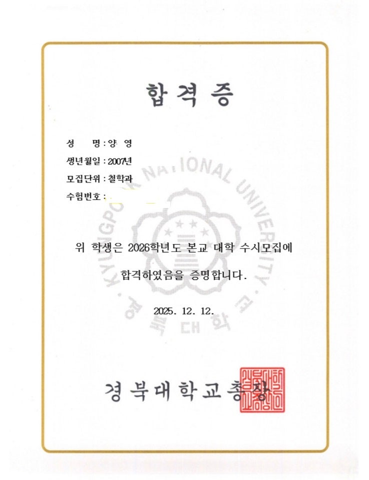 합격을 축하합니다. 한 해 동안 마음고생 많았습니다. 경북대 철학과 논술전형(인문논술) 합격 경남 외국어 고등학교 양O영 문의 010-8341-5505 부산논술토마토학원(인스카이토마토학원) 부산 지하철 2호선 대로변 부산 수영구 남천동19-2 새마을금고건물 3층 <img src="https://blogthumb.pstatic.net/MjAyNTEyMjBfMTQ4/MDAxNzY2MjE2OTg2NDI4.7u15kOrlI1CHwZNf2pTW3YCt1DXV8sSVkyZb_QYmD68g.9kUPoSsCy_v6CQGvgZOkAGapzjuBDcWP93k3P3UHUucg.JPEG/%B0%E6%BA%CF%C3%B6%C7%D0%BE%E7O%BF%B5.jpg?type=s3" />