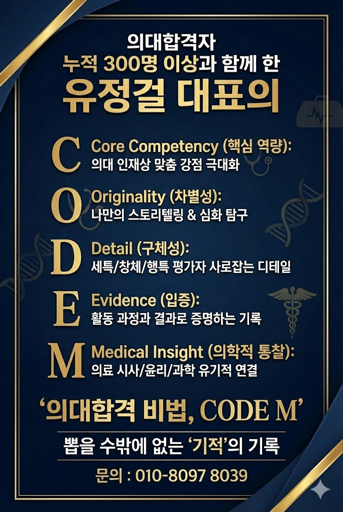 의대 합격자 누적 300명, 유정걸 대표의 결정적 한방! "뽑을 수밖에 없는 '기적'의 기록, CODE M을 해독하라" 12월 29일 의대 학생부 기록 프로그램 설명회 참석 링크 https://forms.gle/cSFLv4VCB1Bjw9v5A 20251229 의대 학생부 기록 프로그램 설명회 일시 : 2025년 12월 29일 월요일 오전 11시 장소 : 의문을열다 남천본원 4층 장기려홀 내용 : 의문을열다만의 의대 합격 학생부 기록을 위한 시그니처 비교과 프로그램 안내 설명회 설명회 안내 블로그 : forms.gle 의대 입시, 바늘구멍보다 좁은 문을 통과하기 위해 무엇이 필요할까요? 최상위권 성적은 기본입니다. 하지만 합격의 당락을 가르는 것은 결국 '기록의....... <img src="https://blogthumb.pstatic.net/MjAyNTEyMjJfMTkg/MDAxNzY2Mzc4NDQ0ODgx.Xp8wS226w53Oi2wbsnO0-oMTYaFO5d9UQUGI4raglOIg.lEEnhzVlDSDQndGYKGVID5giMagfpM5sSOQsPSMTx6kg.PNG/KakaoTalk_20251222_100951768.png?type=s3" />