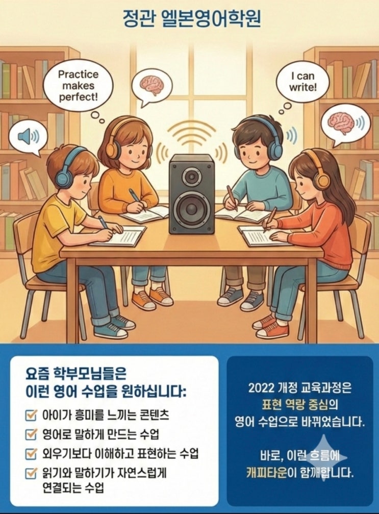 안녕하세요, 정관 엘본영어학원입니다! 최근 영어 교육의 흐름이 급격하게 변하고 있다는 사실, 알고 계시나요? 예전에는 단어를 외우고 문법을 분석해서 시험을 잘 보는 것이 중심이었다면, 이제는 '얼마나 내 생각을 자유롭게 표현할 수 있는가'가 핵심이 되었습니다. 오늘 정관 엘본영어학원에서는 요즘 학부모님들이 가장 원하시는 영어 교육의 정답, 캐피타운의 모국어 습득 방식에 대해 이야기해 보려 합니다. 1. 2022 개정 교육과정의 핵심: 표현 중심 영어 보내주신 영상에서도 강조하듯, 예전의 교육 방식이 읽기 → 문법 → 시험이었다면, 이제는 말하기 → 쓰기 → 자기표현으로 그 중심이 이동했습니다. 교육부에서도 표현....... <img src="https://blogthumb.pstatic.net/MjAyNjAyMjRfNjMg/MDAxNzcxOTM5MjIwNzAx.Dc_cDC3cNlrsXU3uyQiYfEeKdhYzjc5w-QsefKsYmbAg.02G6VfuIM18ZuN6ijvhqb6QKWdht5qfTz3Jegeus6tAg.JPEG/900%A3%DF1771939219286.jpeg?type=s3" />