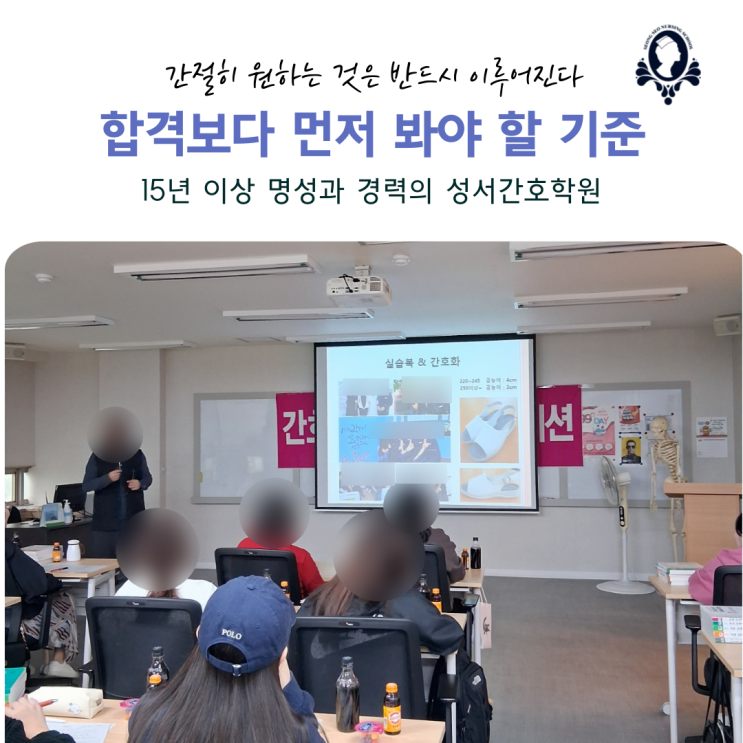 안녕하세요. 성서간호학원 원장 김정애입니다. 병원에서 근무하던 시절 오래 남아 있는 간호조무사 선생님들을 보며 늘 같은 생각을 했습니다. “저분들은 무엇이 다를까?” 처음에는 경력이 많아서 그렇다고 생각했습니다. 손이 빠르고 일을 잘해서라고도 생각했죠. 그런데 시간이 지나면서 알게 됐습니다. 오래 남는 사람 들은 현장을 버틸 수 있는 구조를 가진 사람이라는 것을요. 그리고 그 기준이 지금의 교육 방향을 만들었습니다. “속도”가 아니라 “방식”이 달랐습니다 현장에서 오래 남아 있는 분들을 보면 일을 빨리 배우는 사람이 아니라 자기 속도를 알고 움직이는 사람이 었습니다. 처음부터 능숙한 사람이 아니라 모르는 것을 그....... <img src="https://blogthumb.pstatic.net/MjAyNjAyMjFfMjMg/MDAxNzcxNjAwMjAwMTUz.UzUIIwz4Mm4B9G3oahTx58c7li318kXEnHGMY0D34fgg.MOs72ZuT41Qu9l6mMnALlRxQaRYT5XyK_yxnJXrWdy8g.PNG/%C1%A6%B8%F1%C0%BB-%C0%D4%B7%C2%C7%D8%C1%D6%BC%BC%BF%E4_-001_%2854%29.png?type=s3" />