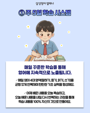 안녕하세요! 웨일즈 삼성영어 쎈수학입니다!!~~ 영어 학원은 정말 많지만 우리 아이를 어디에 보내야 하는지 고민 되시죠?? 오늘은 초등 영어 학원을 삼성영어로 선택해야하는 이유에 대해서 알려드리겠습니다! 삼성영어를 선택해야 하는 이유1. 주 5일 학습 시스템 삼성영어는 주 5일 수업으로 균형 있게 반복하며 탄탄한 기초 실력을 형성합니다! 삼성영어를 선택해야 하는 이유2. 나에게 딱 맞춘 1:1 개인별 맞춤 수업 같은 나이, 같은 학년이라고 해서 영어 실력까지는 같지는 않죠. 삼성영어 셀레나는 수준별 맞춤형 교재로 선생님과 1:1 맞춤 수업을 진행합니다. 삼성영어 셀레나를 선택해야 하는 이유3. 체계적인 커리큘럼 삼성영어 셀레....... <img src="https://blogthumb.pstatic.net/MjAyNjAzMDlfOCAg/MDAxNzczMDQ0ODM5MTM0.CA8INiUK1_-Y19idsyk6Gcr4uJ7DWgZatkqikqqXLXog.xhXKB84N2lq0g2J1N6lcI3Iyi2RwXr2VsB0IQFuj100g.PNG/image.png?type=s3" />