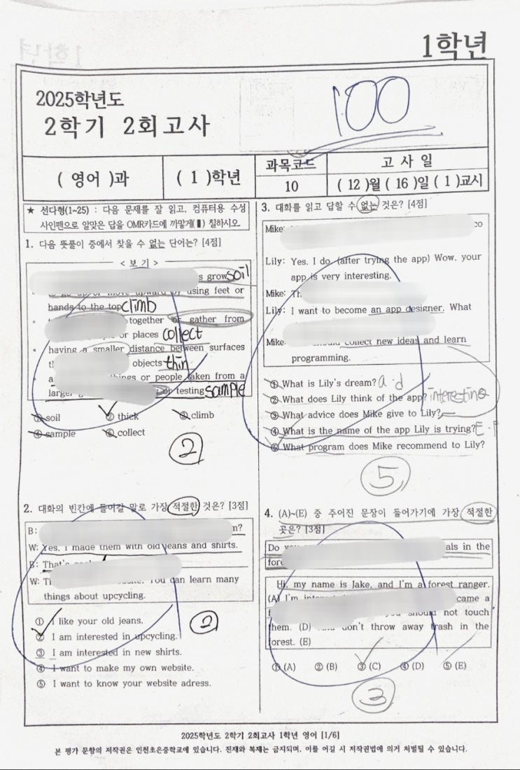 완벽한 정답풀이 첨삭이 다 되어있습니다 누가보면 선생님이 대신 풀어줬다고 오해하겠지요?! 제가 '오답을 정답으로 고쳐가며 풀어라' 항상 오더를 주지만 쉽지 않은게 사실입니다 내가 아는것에 확신이 있을 때 나올 수 있는 완벽한 시험지 ~ !!! 학생의 영어 첫 만점을 같이 할 수 있어 좋습니다~! 축하합니다!!! #내신1등급 #청라영어 #특목고 #완벽관리 #내신완벽대비 #청라중등영어 #청라고등영어 #영어전공원장직강 #영어A <img src="https://blogthumb.pstatic.net/MjAyNTEyMjFfMjE5/MDAxNzY2MzEyMjM3MjY5.KthoIUMN3WvuSQm_SBFbHY10Zbh5BYNDS6kMw5xRqVEg.zt33awgS5YcfSf88CsoJT27OlJsD4UAjSrr4t5555DYg.JPEG/900%A3%DFIMG%A3%DF3240006.jpeg?type=s3" />