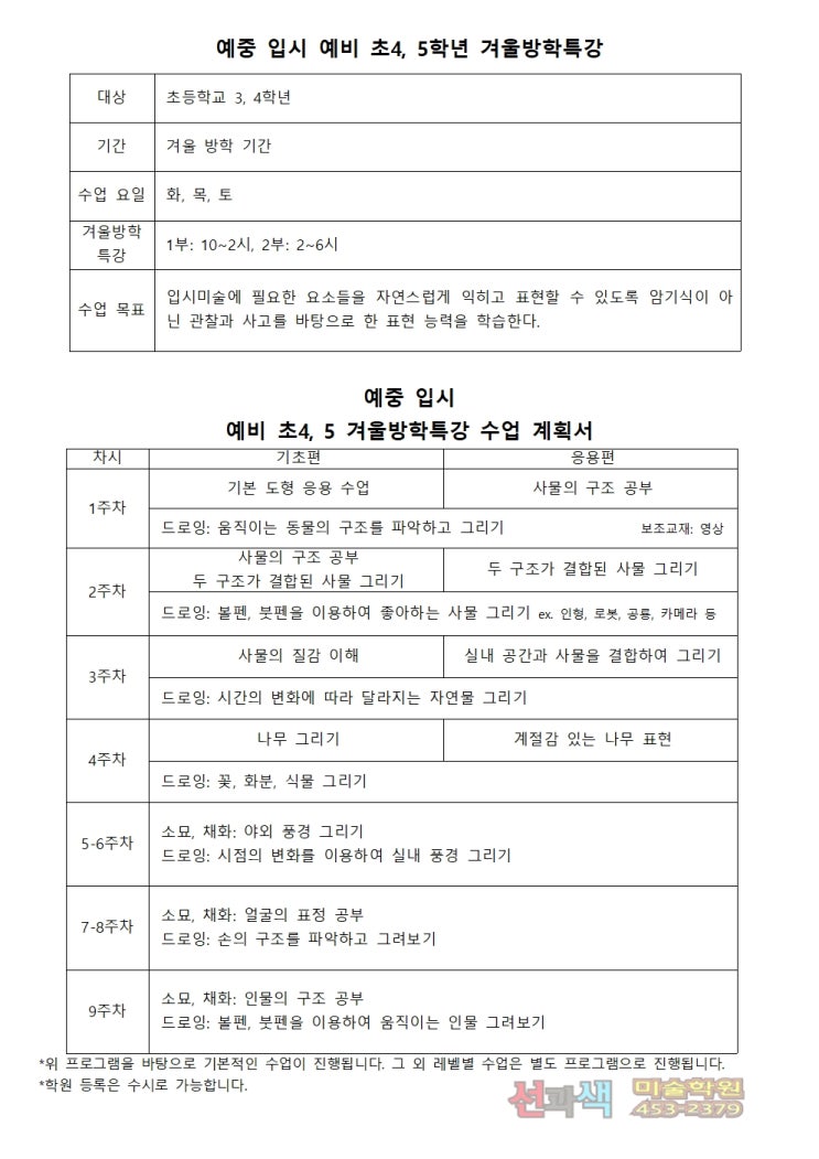 안녕하세요 선과색미술학원입니다. 초등 예비반 겨울 방학 특강 안내드립니다. 겨울방학을 맞이하여 다양한 프로그램을 준비했으니 많은 관심 부탁드립니다. 열심히 또 달려봅시다-! 학원 상담은 수시로 가능합니다. ☎ 상담문의 02-453-2379 <img src="https://blogthumb.pstatic.net/MjAyNTEyMzBfNjQg/MDAxNzY3MDcwMjIyNjEy.Mf4ee12NmkueDT-SxG1F0GazTqQP4UlUjOaDoIdvYe8g.J47S1mg_3cJym7hksCM8Ei_IYXWVMoJrzNEwTQfVg3Yg.JPEG/%B0%DC%BF%EF%B9%E6%C7%D0%C6%AF%B0%AD_%BC%F6%BE%F7%B0%E8%C8%B9%BC%AD_2025-26001.jpg?type=s3" />