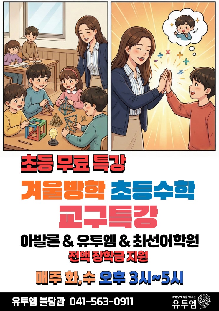 아발론 교육 랭콘 잉글리쉬 최선어학원 유투엠 에듀고 재원생 무료 특강 2026 겨울방학 초등 수학 교구 특강 안내 겨울방학, 아이에게 문제집만 더 풀게 하는 방학으로 남기고 싶지 않다면 이번 겨울은 조금 다르게 준비해 보세요. 에듀고에 속한 모든 재원생들을 위해 아발론 × 유투엠 × 최선어학원학생들이 함께할 수있도록 준비한 초등 무료 겨울방학 수학 교구 특강을 진행합니다. 이번 특강은 ✔ 계산 위주의 수업이 아닌 ✔ 손으로 직접 만들고, 만지고, 조립하며 ✔ “수학이 이렇게 재미있는 거였어?”를 느끼게 하는 체험 중심·사고력 중심 프로그램으로 구성되었습니다. 왜 ‘교구 수학’인가요? 아이들은 보는 수학 → 만지는 수학 →....... <img src="https://blogthumb.pstatic.net/MjAyNjAxMDdfMjA2/MDAxNzY3NzY3MjM4NjUx.SIOMKl3R6BcjxIrLOwK1LWDTixnVsrN3kZTc7hrZ8UMg.cJPnft0UjoILo6wd_gC3p6qY2cc-c07-fnlneG9g-aIg.JPEG/004.jpg?type=s3" />