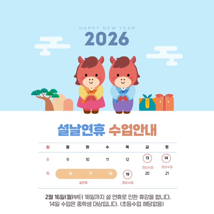 안녕하세요. 레나영어입니다. 2월 17일 설날을 맞이하여 아래와 같이 수업을 진행합니다. 2월 14일은 중학생 대상이며, 초등학생은 2월 13일, 19일 정상수업 진행됩니다. 가족과 함께 웃음 가득한 설 연휴 보내시고, 새해에도 아이들의 성장에 늘 함께하는 레나영어가 되겠습니다. 새해 복 많이 받으세요. <img src="https://blogthumb.pstatic.net/MjAyNjAyMTJfMjc0/MDAxNzcwOTA3MTUzNjY1.qrS-G7TjyiY4LrnI8W-zy5nmri_xu7Y_PMwmI8qLHQMg.zX97WZ2SsgaOaLQplcBhnm2NDHhg5IUXh5VAhZRuRwsg.PNG/%BC%B3%BF%AC%C8%DE%BE%C8%B3%BB_%282%29.png?type=s3" />