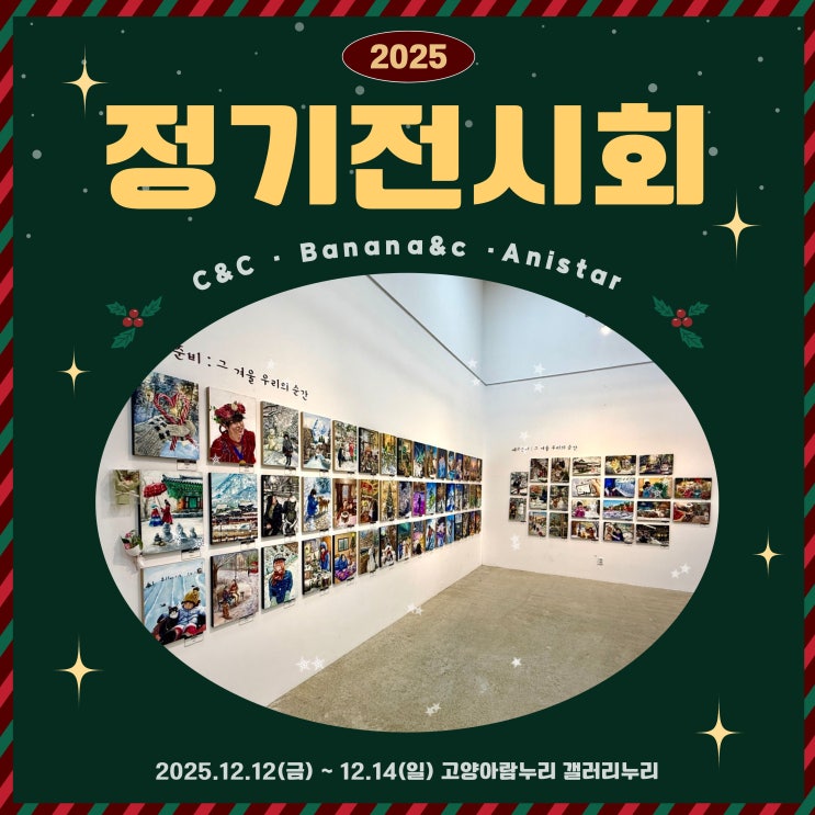 안녕하세요 백마C&C미술학원 예고반입니다.^^ 오늘은 12월 12일(금) ~ 14일(일)까지 진행했던 2025 정기 전시회 현장을 보여드리려 합니다! 저희 예고반 학생들이 열심히 그린 작품도 전시되며 다른 캠퍼스 친구들과 선배님들의 그림도 보면서 시각적으로 즐거움을 많이 얻고 간 시간이 아니었을까 싶어요! 저희 예고반 학생들의 그림은 고양 아람누리 제5전시관에서 볼 수 있었는데요~ 퀄리티 높은 그림들 속에는 자신만의 겨울 풍경과 추억을 담아낸 아이들의 모습들이 보였답니다~! 열심히 그린 본인 작품 앞에서 인증샷도 남겨보았고~ 실기대회 수상작들과 미대입시 합격작들 그림을 보면서 의지를 다지는 시간을 가졌고요~ᄒᄒ 가족분들....... <img src="https://blogthumb.pstatic.net/MjAyNTEyMjZfMjUx/MDAxNzY2NzUzNzA3NTM0.Ry-R2fkAaUdxedavxsQHOxN_s8IlDhKKFA1U1HqSZNIg.o6x_3hNnP3u3l-M2y7PPkHJqRHwPNvP63wWupw1lSQUg.JPEG/%C1%A6%B8%F1%C0%BB_%C0%D4%B7%C2%C7%D8%C1%D6%BC%BC%BF%E4_%2829%29.jpg?type=s3" />