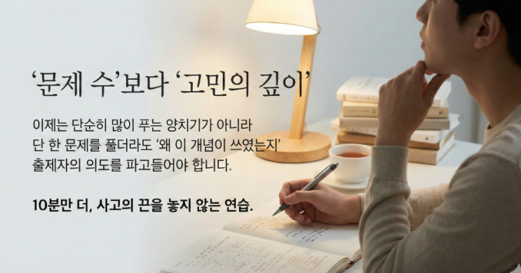요즈음은 다양한 이유로 재원생 혹은 신입생 등 참 많은 상담을 진행합니다. 그중에 특히 오늘 상담 온 예비 고2 학생의 이야기가 유독 마음에 남습니다. 이 학생은 중학교 3학년까지 예체능 분야를 준비했습니다. 그러다 고등학교 진학을 앞두고 진로를 변경하여, 고1이 되어서야 본격적으로 공부를 시작한 듯했습니다. 다른 친구들보다 늦었다는 생각 때문이었을까요? 학생이 지난 1년간 꽤나 많은 학습량이 있었던 듯싶습니다. 하지만 실제일지는 지도해 봐야 알 일이긴 합니다. 학생은 그동안 쏟아부은 시간과 노력에 비해 성적이 기대만큼 나오지 않아 답답함을 호소했습니다. 상담을 진행하며 그 이유를 조금은 짐작할 수 있었습니다. ....... <img src="https://blogthumb.pstatic.net/MjAyNTEyMzBfNzgg/MDAxNzY3MDM5OTA1MTQ2.-0atuWwJJsWnRfHZuMQWcYGexmtHkAw5Moz7zeo22y4g.KMTVcbL1qQrSQ6d1m0XI9zVTgk9J9yIXn8j3cJWo5e4g.PNG/900%A3%DF1767039831443.png?type=s3" />
