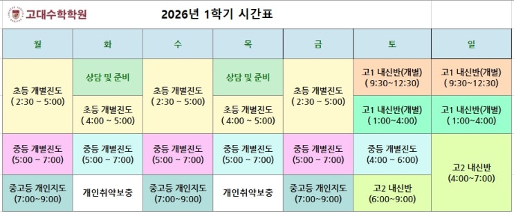 정규반 이외에 4:30~6:30 처럼 시간 조절 가능한 반도 운영중입니다. 안녕하세요! 고대수학입니다! 2026년 1학기도 모두 화이팅! 입니다. 새학기가 시작되면 가장 많이 듣는 말이 있습니다. “우리 아이 시간표가 아직 조정이 안 돼서요..” 방과후, 학원, 숙제, 이동 시간까지 맞추다 보면 좋은 학원을 찾고도 시간 때문에 놓치는 경우가 많습니다. 그래서 고대수학학원은 정규반 외에도 시간 조절이 가능한 수업을 운영합니다. # 초등부 수업 선택 방식 초등부는 보통 매일반 (4~5시) 월·수·금 1시간 40분반 을 많이 선택하지만, 필요에 따라 주간 총 5시간 기준으로 자유롭게 조합하여 학생에게 맞는 시간표로 구성할 수 있습니다. 학생마다 필....... <img src="https://blogthumb.pstatic.net/MjAyNjAyMjFfMTAy/MDAxNzcxNjc0MTYyNjY3.ylOxx7tEC8hkGaw5RCNA9GovY5ajFdn5AmykVRasg1Ag.75QqFgAfMxhbbPbNH2ztaK5KWjgAcuqHNJoVY1adjOcg.JPEG/2026_1%C7%D0%B1%E2_%BD%C3%B0%A3%C7%A5_%C0%FA%C0%E5.jpg?type=s3" />