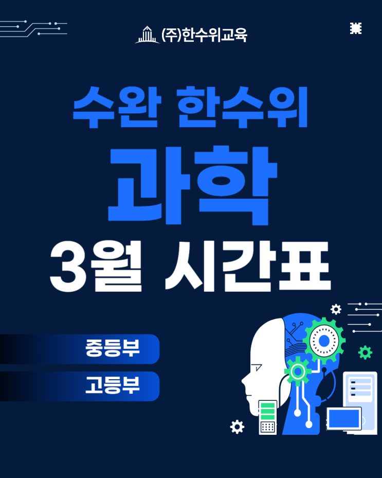 수완지구 과학학원 한수위 과학학원 제7157 호 안녕하세요. 수완지구 수완동 과학학원 한수위 과학 전문학원입니다. 2026년 3월 새 학기에 개강하는 중등 과학, 고등과학 시간표 안내드립니다. 중등 과학은 탄탄한 기초체력을 기르는 중요한 시기입니다. 고등과학을 배우기 위한 용어, 기본 개념, 원리를 배웁니다. 중등 과학 내용을 온전히 이해하며 외우지 않을 경우 고등과학의 복잡한 수식을 이해하기 어렵습니다. 이해하며 암기를 할 경우 단순히 암기하는 것보다 훨씬 오래 기억에 남을 수 있습니다. 어떻게 잘 이해하고 오래 기억에 남게 외울 수 있는지 수완지구 한수위 과학학원 중등 과학 커리큘럼을 경험해 보세요. 수완동 과학학원 한....... <img src="https://blogthumb.pstatic.net/MjAyNjAyMjFfNzgg/MDAxNzcxNjI3NDI1NDc5.Vm0UVkfR6jM_6GtyL8IcjW0qrT26n8INW19N3KW_4D0g.QWCs4HjHXr-H5qWcCBmjl5sLoegXsZJ9Eu0JRyn0ovwg.PNG/002.png?type=s3" />