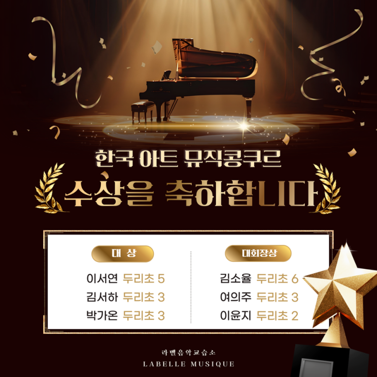 안녕하세요 ~ 송강동 라벨음악교습소 입니다! 하반기 콩쿨과 겨울특강 소식 전해드려요 2025 12월 13일에 열린 한국 아트 뮤직콩쿠르에서 우리 라벨친구들이 전원입상을 하였습니다 주말에도 나와 열심히 연습해준 아이들 짧지 않은 연습 과정이 무대위에서 빛이 났던 순간이였습니다✨ 끝까지 포기하지 않고 노력해준 라벨친구들 너무 고마워♥️ 결과보다도 무대에 서는 경험이 우리 아이들에게 큰 성장의 시간이었습니다! 아이 한명 한명의 속도에 맞춰 무대에 서는 경험을 차근차근 만들어 가고 있어요 그동안 정말 수고 많았어 ⠀ ⠀ ▷ 피아노 전공 원장 직강 ▷ 체계적인 1:1 원장 레슨 ▷ 개인별, 수준별 교재 선정....... <img src="https://blogthumb.pstatic.net/MjAyNTEyMTRfMTIx/MDAxNzY1Njg3OTg5Mjc5.3SVuL_5rH-9uWkdrIDNFfs4r1wVqCLK3_8CimhTnumIg.vz_luONeDOKUTKcCp5x5jQDbr2XTzBanZTBr7ZO1RbUg.PNG/%C1%A6%B8%F1%C0%BB%A3%AD%C0%D4%B7%C2%C7%D8%C1%D6%BC%BC%BF%E4%A3%DF%A3%AD001%A3%A830%A3%A9.png?type=s3" />
