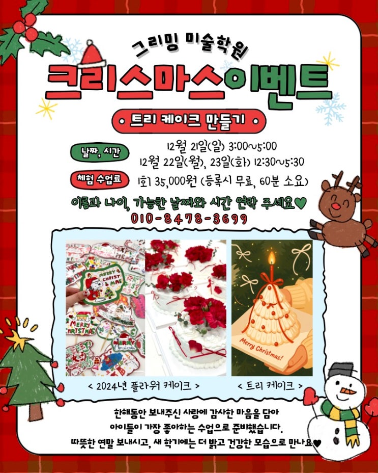 드디어 내일이면 우리 그리밍 친구들이 손꼽아 기다리던 크리스마스입니다~! 그리밍 미술학원에서는 그동안 보내주신 사랑에 보답하기 위해 특별한 수업을 진행했어요! 바로바로~ 크리스마스 케이크 만들기 수업입니다:) 우리 친구들이 이 수업을 너무 너무 기대하고 있었던 것 만큼 열심히 잘해줘서 선생님들도 행복했어요:) 그러면 열정이 넘쳤던 케이크 만들기 시간! 같이 한번 보러가실까요~??? 원장님이 직접 만든 100% 동물성 생크림과 신선한 딸기, 샤인머스캣, 귤을 직접 토핑해서 트리 모양으로 만든 케이크 입니다:) 생크림 맛있는 건 물론이구요!! 과일들도 싱싱하고 너무 맛있었어요♥♥♥♥♥ 친구들이 만든 토퍼 들고 사진 찰칵~! ....... <img src="https://blogthumb.pstatic.net/MjAyNTEyMjRfMjcg/MDAxNzY2NTQ5NjMzMzk5.F0dQWPDmY9QaN1vKFKosUBjM7B02PwlvxLiCqai0GAIg.DcZtaR4253UjlBFUPqQwkjUhXqQ60_-fll7f2wL0lMAg.JPEG/KakaoTalk_20251222_201000910_13.jpg?type=s3" />