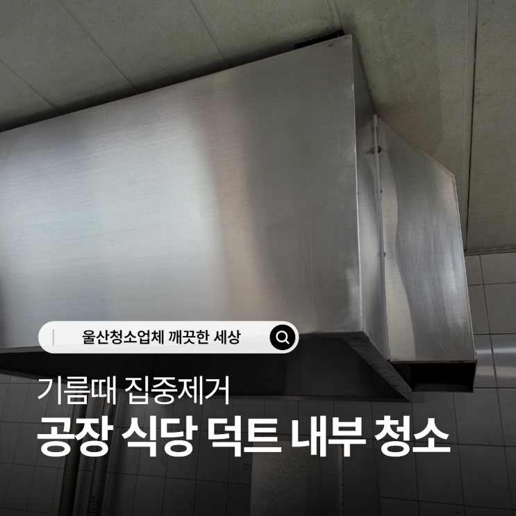 안녕하세요 울산 청소업체 깨끗한 세상입니다. 목차 1.덕트 상태 점검 2.청소 전 준비 및 보호작업 3.공장 식당 덕트 내부 청소 4.마무리 공장 내 식당은 직원들이 매일 이용하는 공간인 만큼 위생 관리가 무엇보다 중요합니다. 특히 조리가 이루어지는 주방은 겉으로 보기엔 깨끗해 보여도 내부에는 기름때와 먼지가 겹겹이 쌓여 있는 경우가 많기 때문에 눈에 보이는 부분뿐 아니라 후드와 덕트 내부까지 관리가 필요한데요 이번에 방문한 현장 역시 오랜 기간 내부 관리가 이루어지지 않아 환기 성능이 눈에 띄게 떨어진 상태였고 주방 전반에 기름냄새가 배어 있었습니다. 덕트 상태 점검 작업 전 후드와 연결된 덕트 내부를 먼저 확인하....... <img src="https://blogthumb.pstatic.net/MjAyNjAyMjVfMTM0/MDAxNzcxOTcyMzY2MzMw._ZvgwkAILN_ZAe_muMJ5wffkykZ_gLGlUCsfTEjqpN4g.MNZzp-3Gjg9lYgAsWdI0Sxylmv_A4csf-KfblsI8EGgg.PNG/1.png?type=s3" />